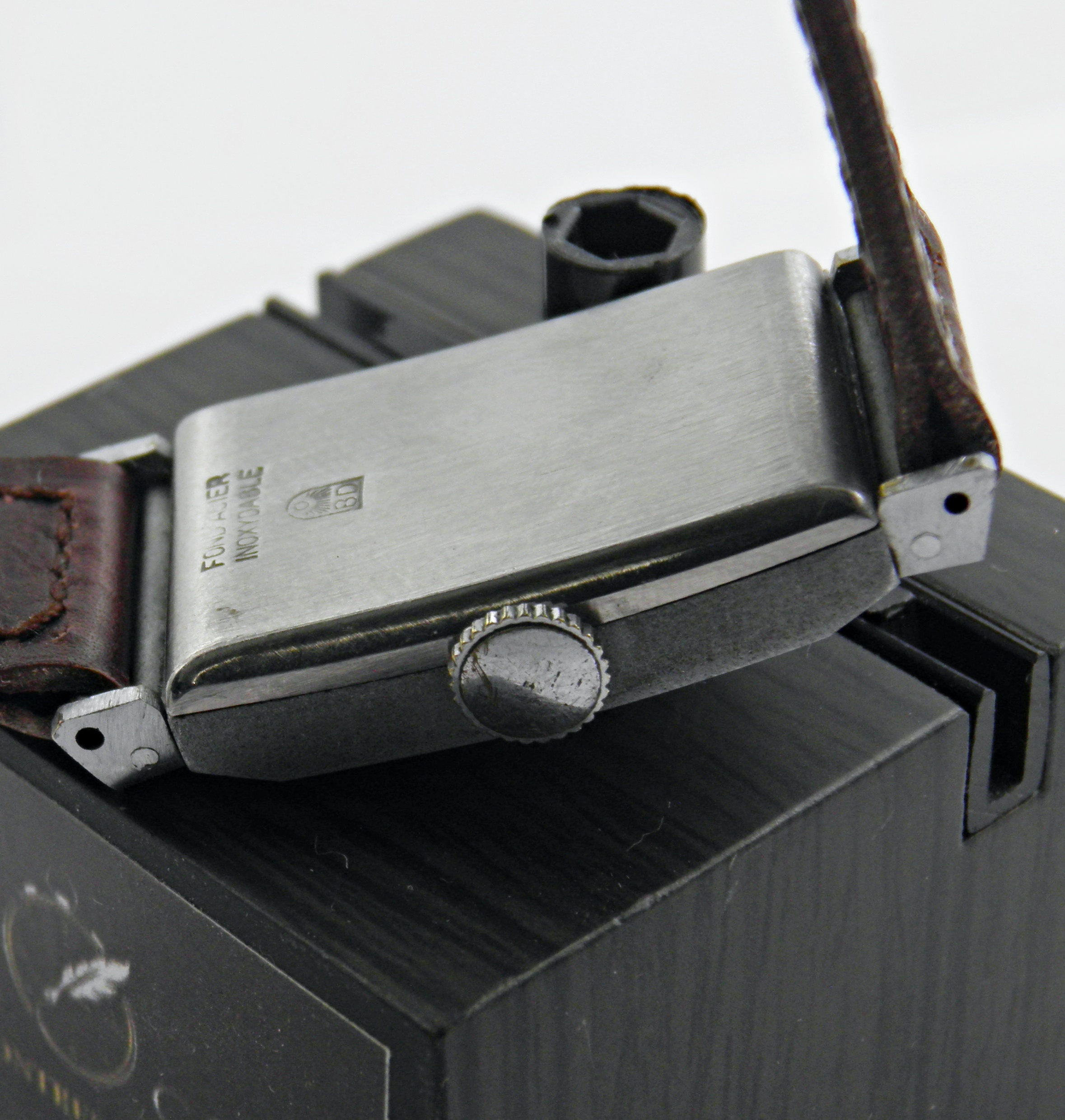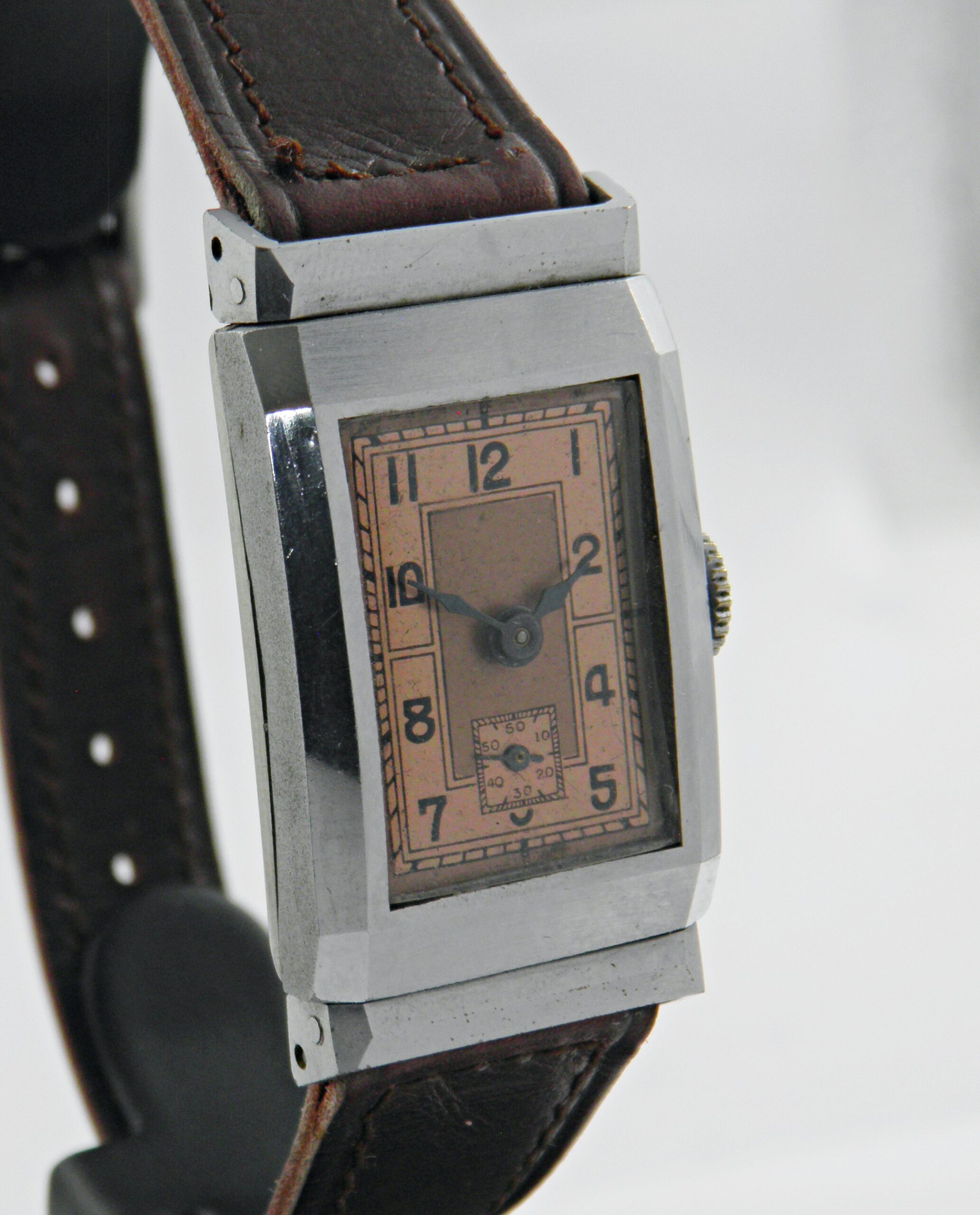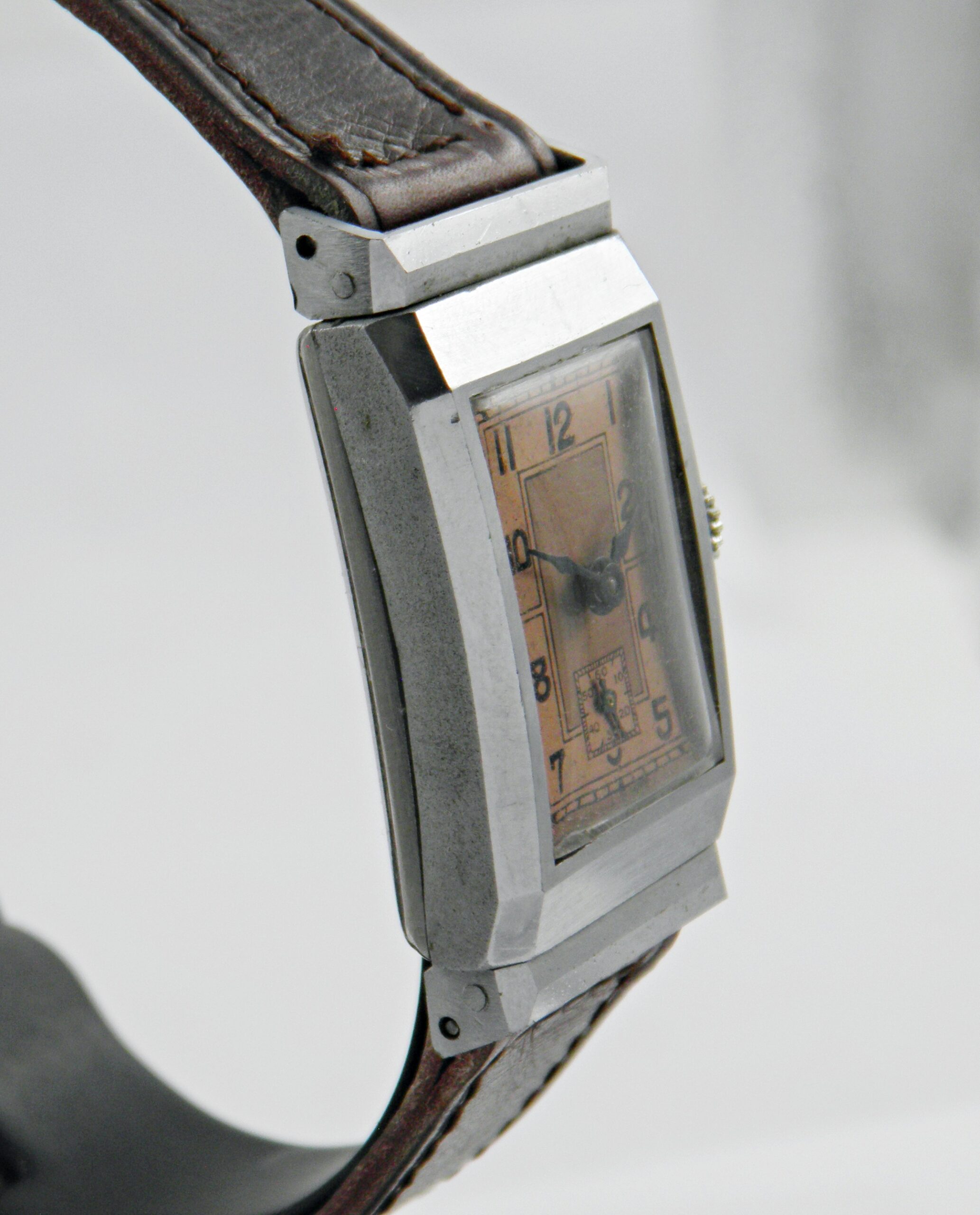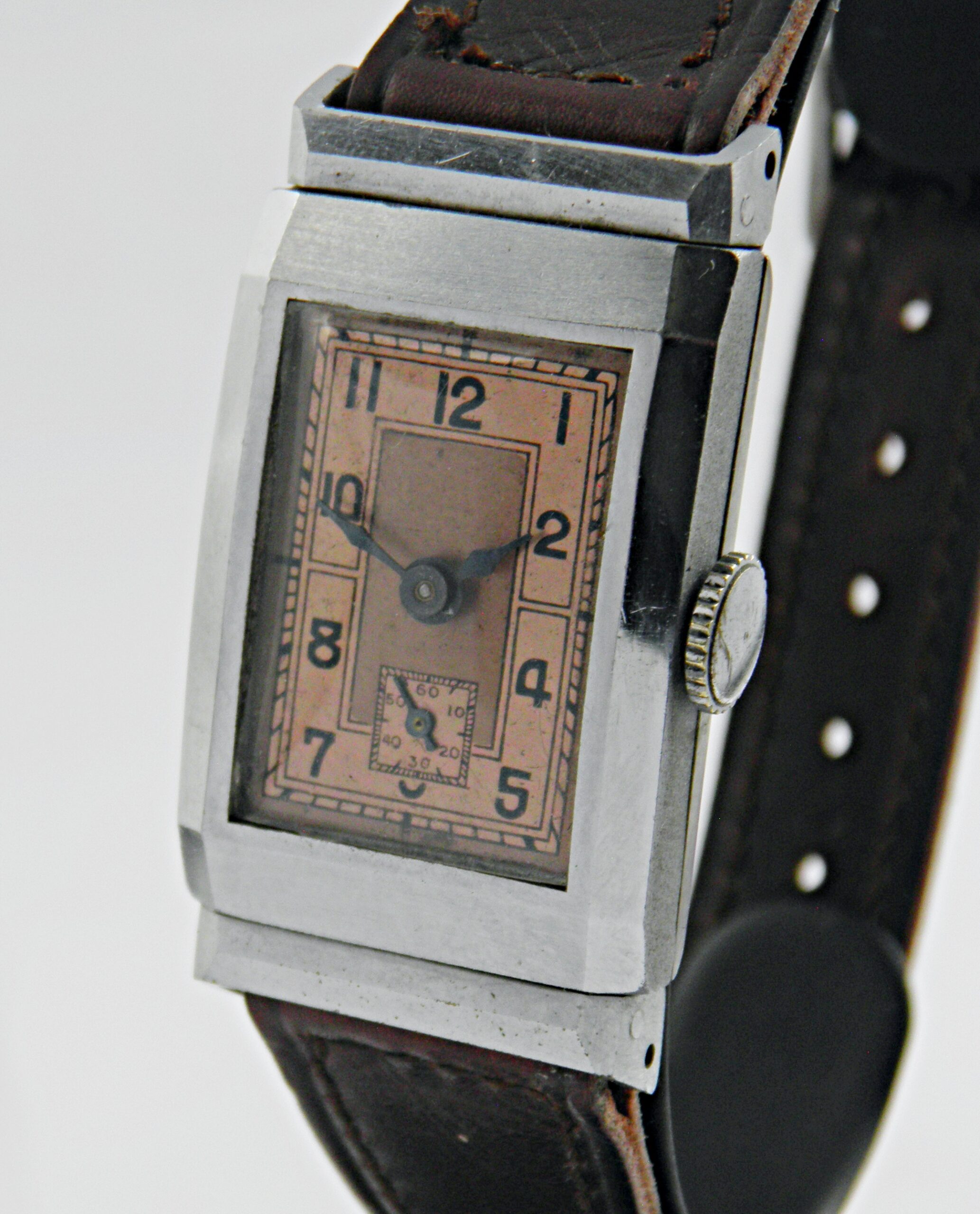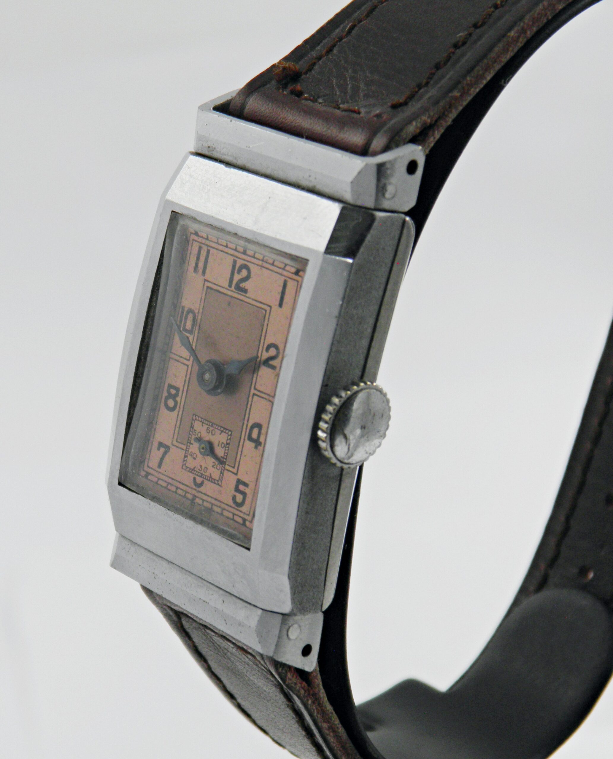 Dans l’esprit des années 30’s, voici un modèle d’un fabricant anonyme, peut être une ébauche. Elle a un boîtier chromé avec ses anses articulées qui permettent à la montre d’épouser la forme du poignet. Elle est équipée d’un calibre mécanique de 15 rubis. Son état est remarquable, assez proche de l’état neuf et une excellente marche. Elle a un bracelet cuir marron, le cadran a une belle couleur saumon. Une belle montre vintage de prés de 100 ans et prête à servir tous les jours.
