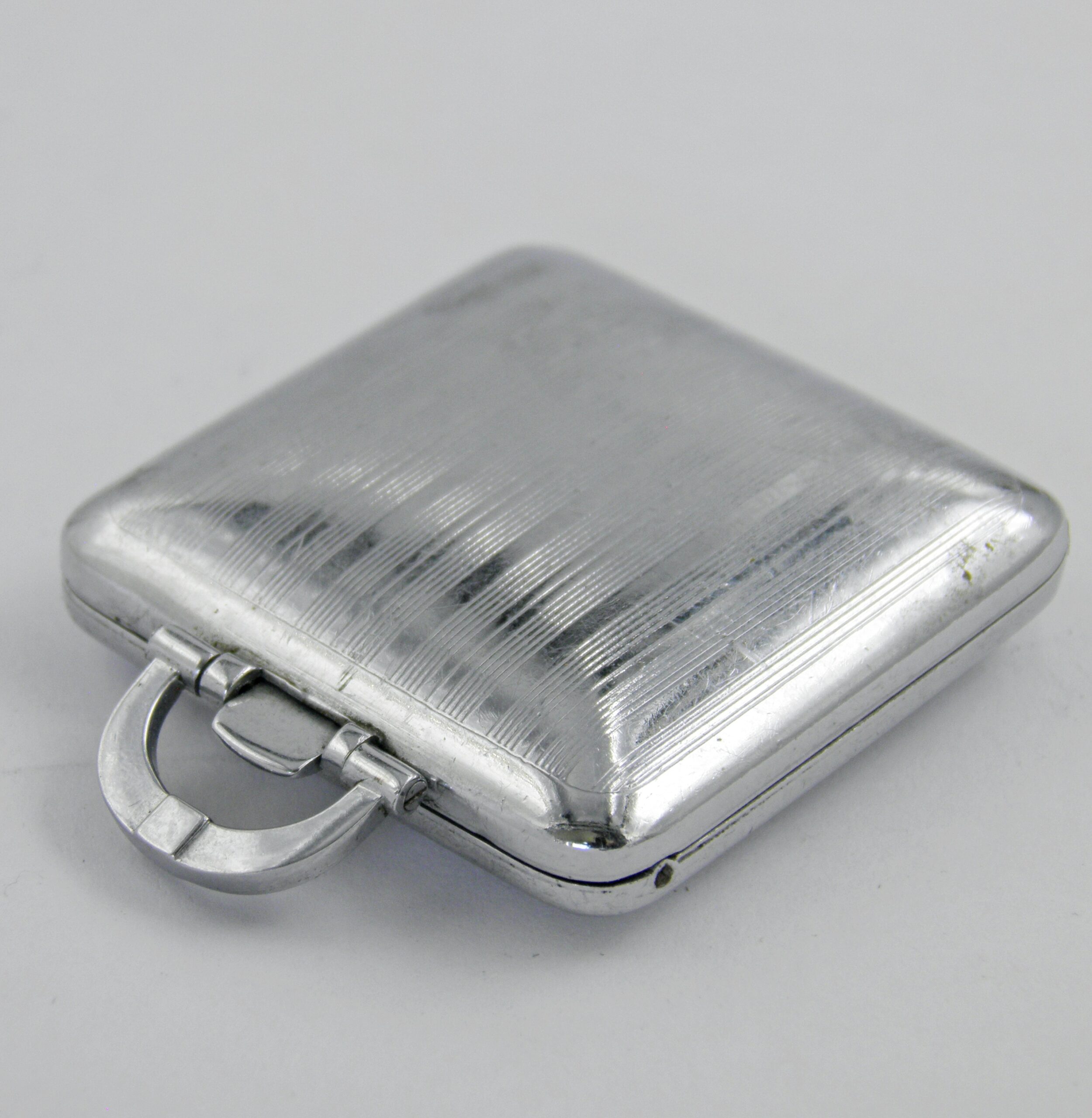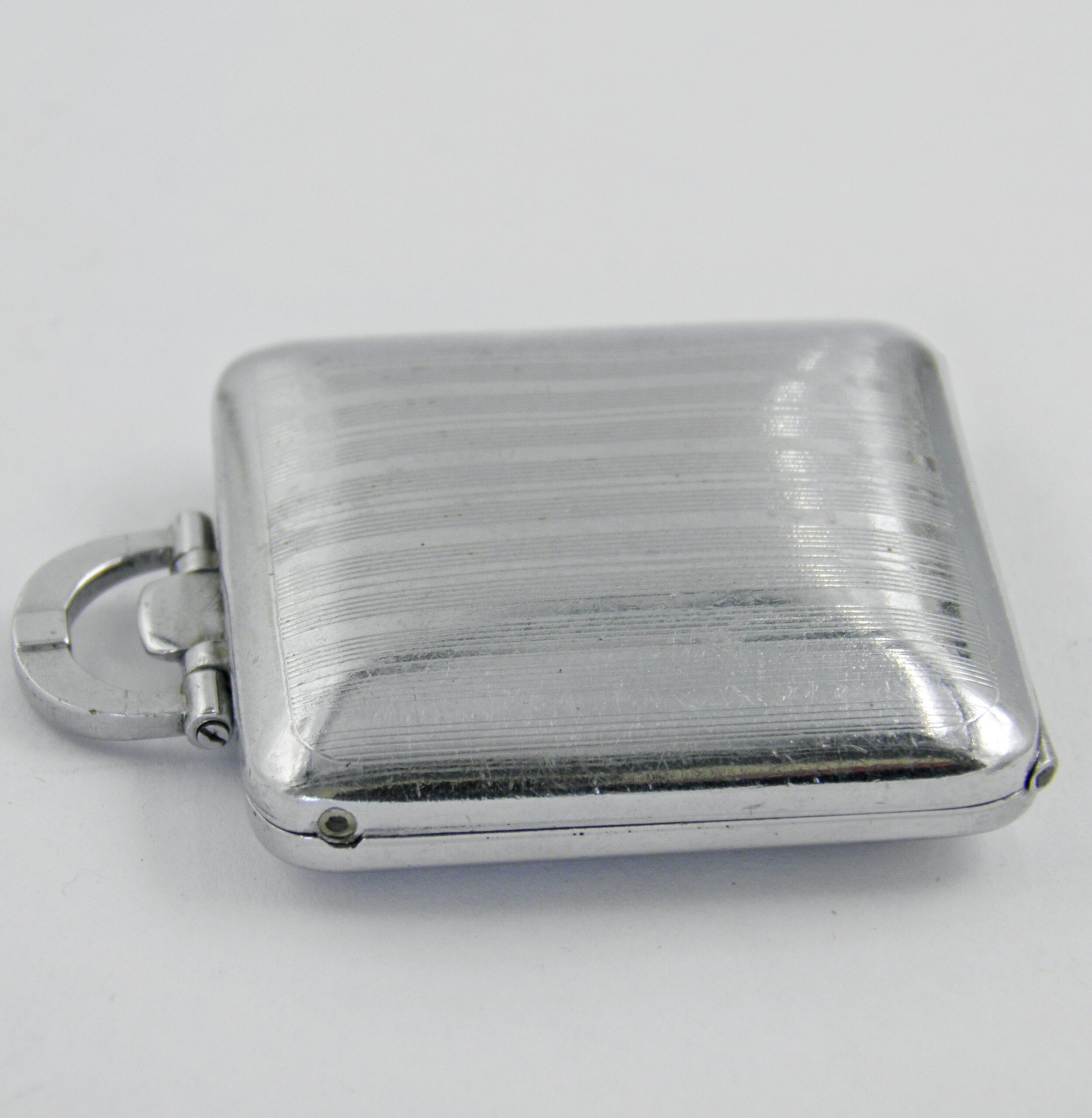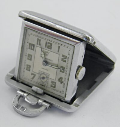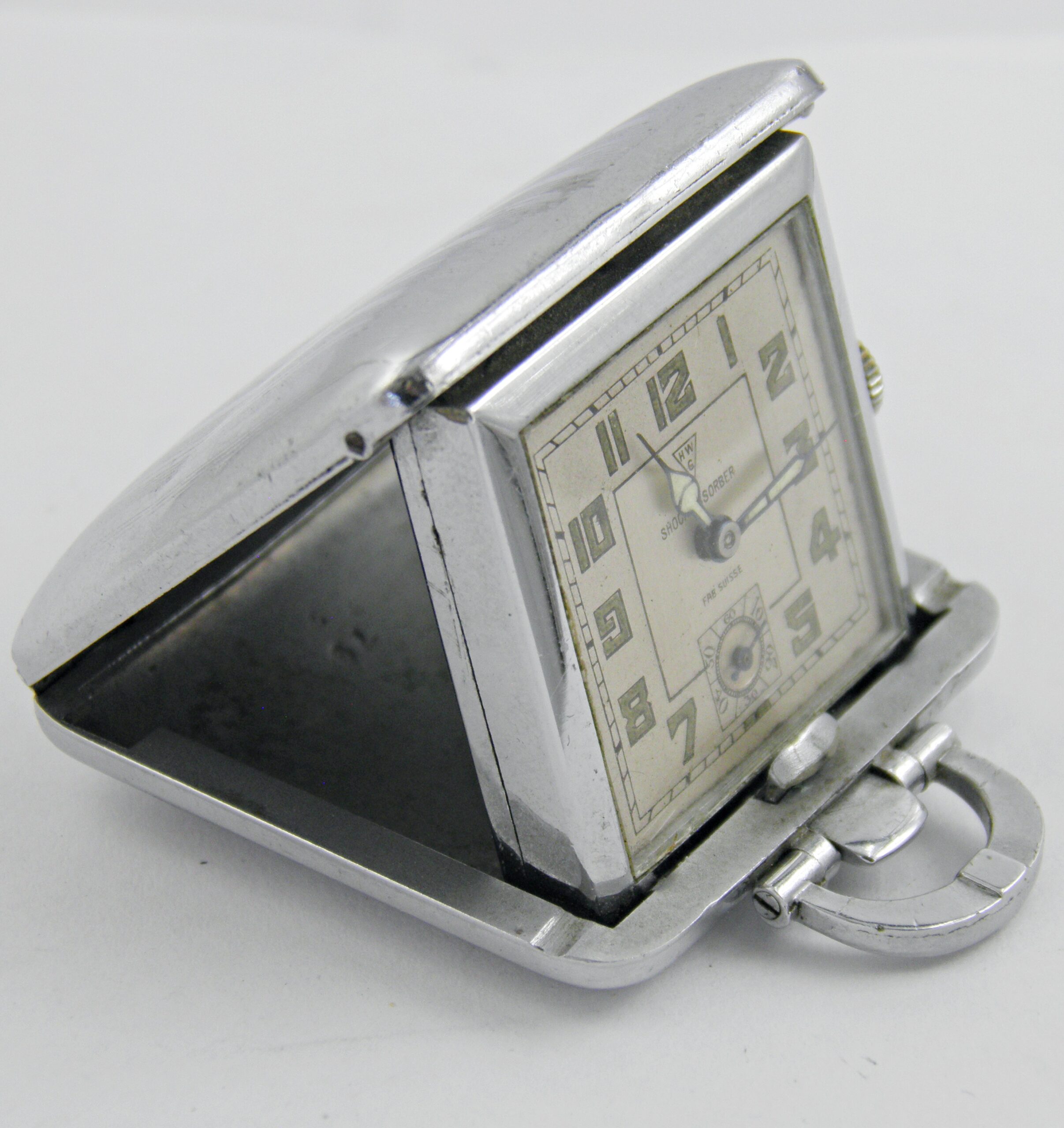 Toujours dans l’univers des objets de curiosité dans le monde de l’horlogerie, une façon de remettre au gout du jour dans les années 40’s, les montres de poches ou de col. Celle çi est signée HWG SWISS et date des années 40’s. Plus modernes que leurs ancêtres, on pouvait soit s’en servir comme montre de poche ou bien les Dames les mettaient en tour de cou sur un sautoir. Elle est équipée d’un mouvement mécanique, le boîtier est chromé. Très bon état de fonctionnement et d’aspect.