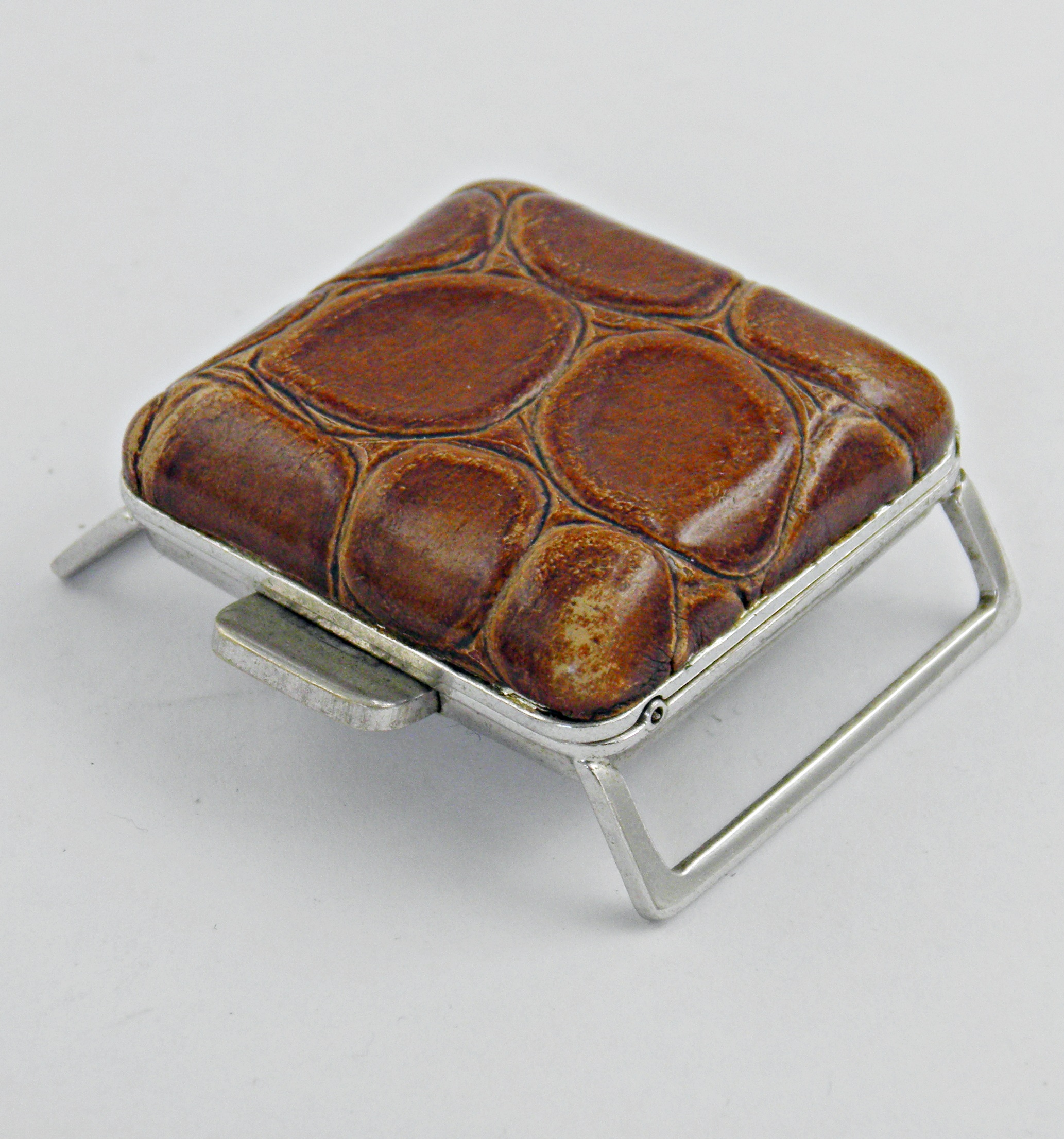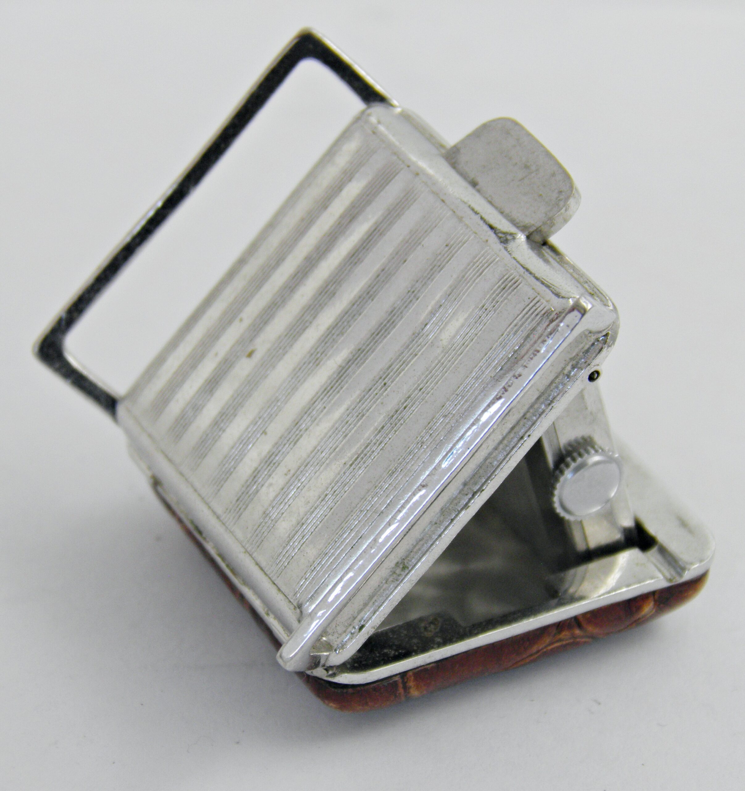 Parmi tous les accessoires fabriqués dans le monde du luxe et de l’horlogerie, l’on pouvait trouver ce genre de petites montres/ pendulettes qui pouvait se fixer à la ceinture et par une simple pression, s’ouvrir et vous donner l’heure ou bien juste posée sur la table de chevet. Un étonnant petit objet luxueux en parfait état de fonctionnement et d’aspect. Elle st d’une marque qui n’existe plus, TAYLOR, équipé d’un mouvement mécanique Suisse.