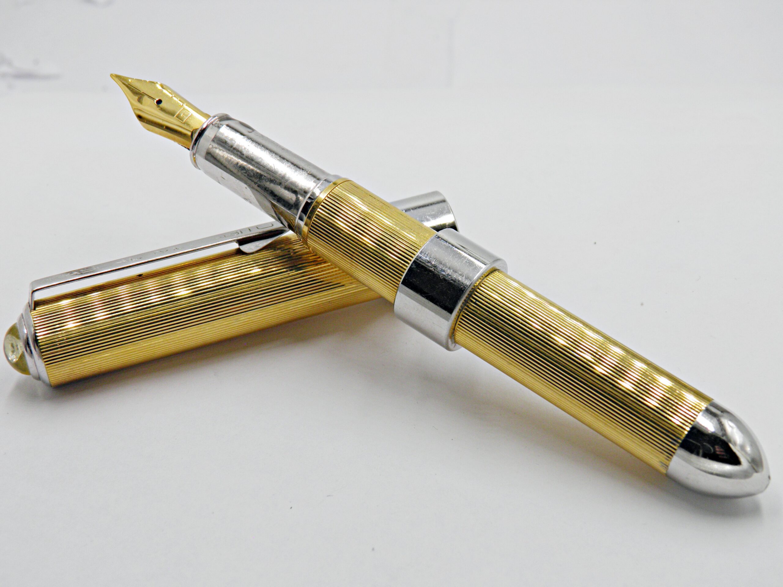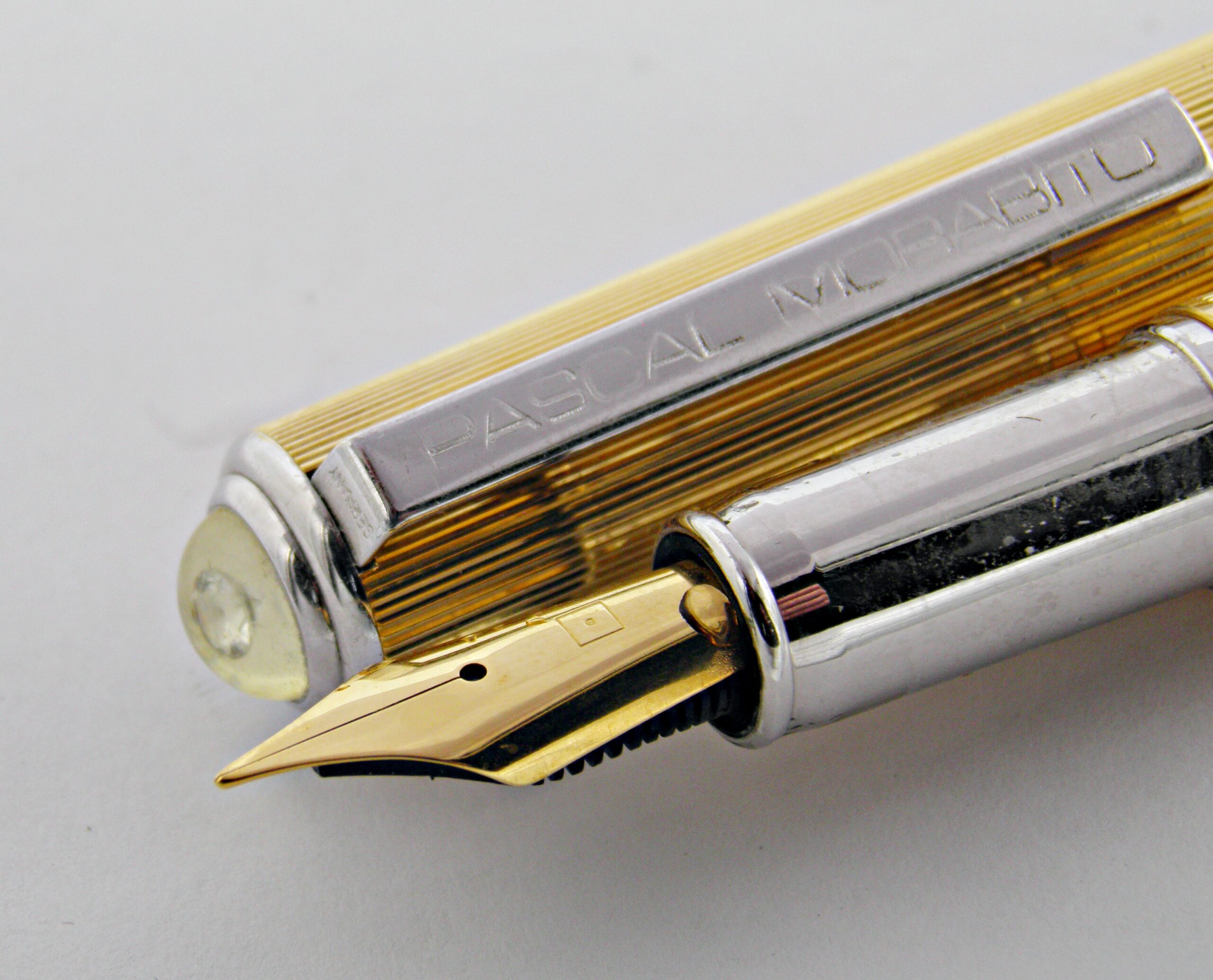 Un étonnant stylo plume du célèbre joaillier, styliste Pascal Morabito, il doit dater des années 90’s. Un très gros stylo plaqué or et motifs lignes, il a une large plume de taille moyenne. A l’extrémité du stylo se trouve un petit diamant de 0,25ct dans une résine transparente.