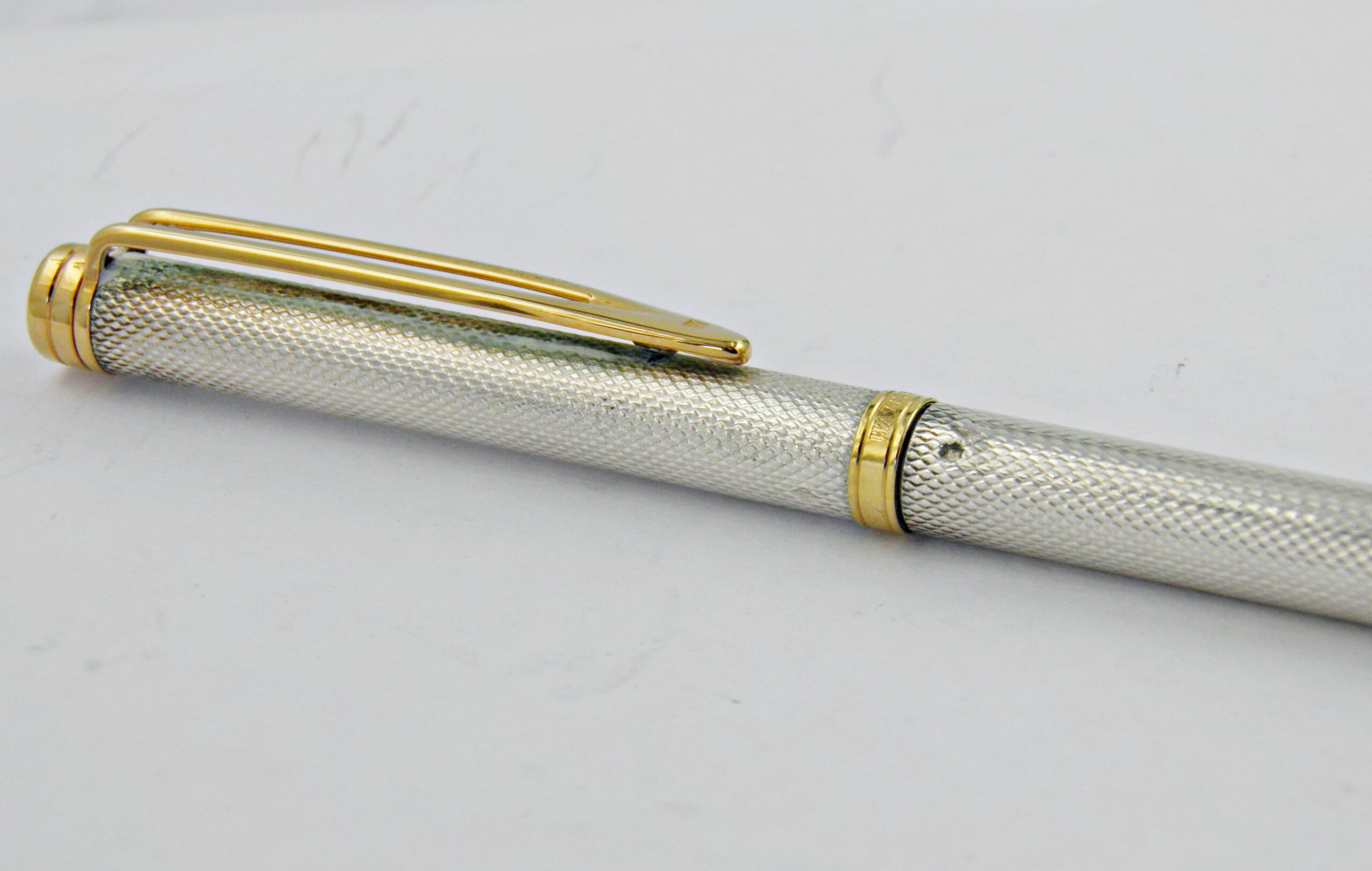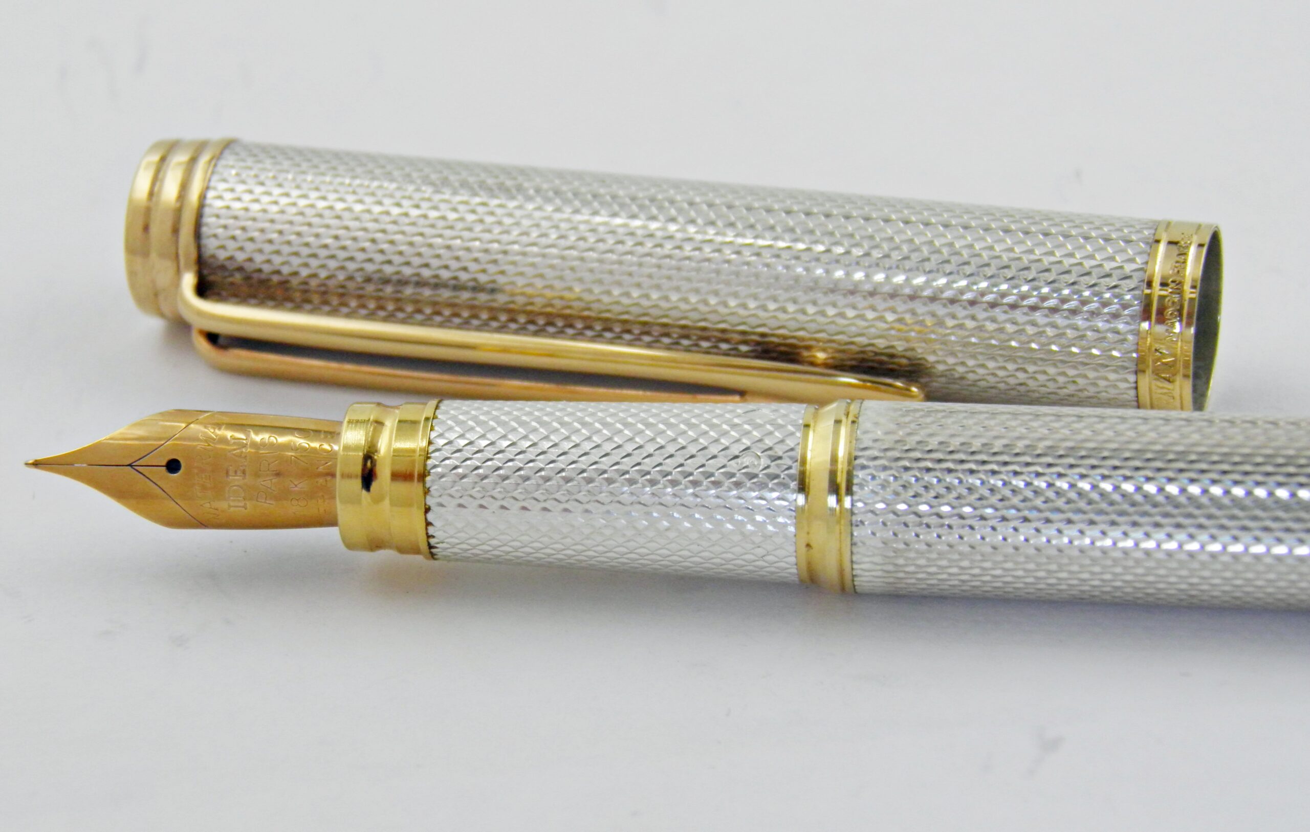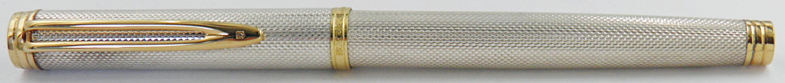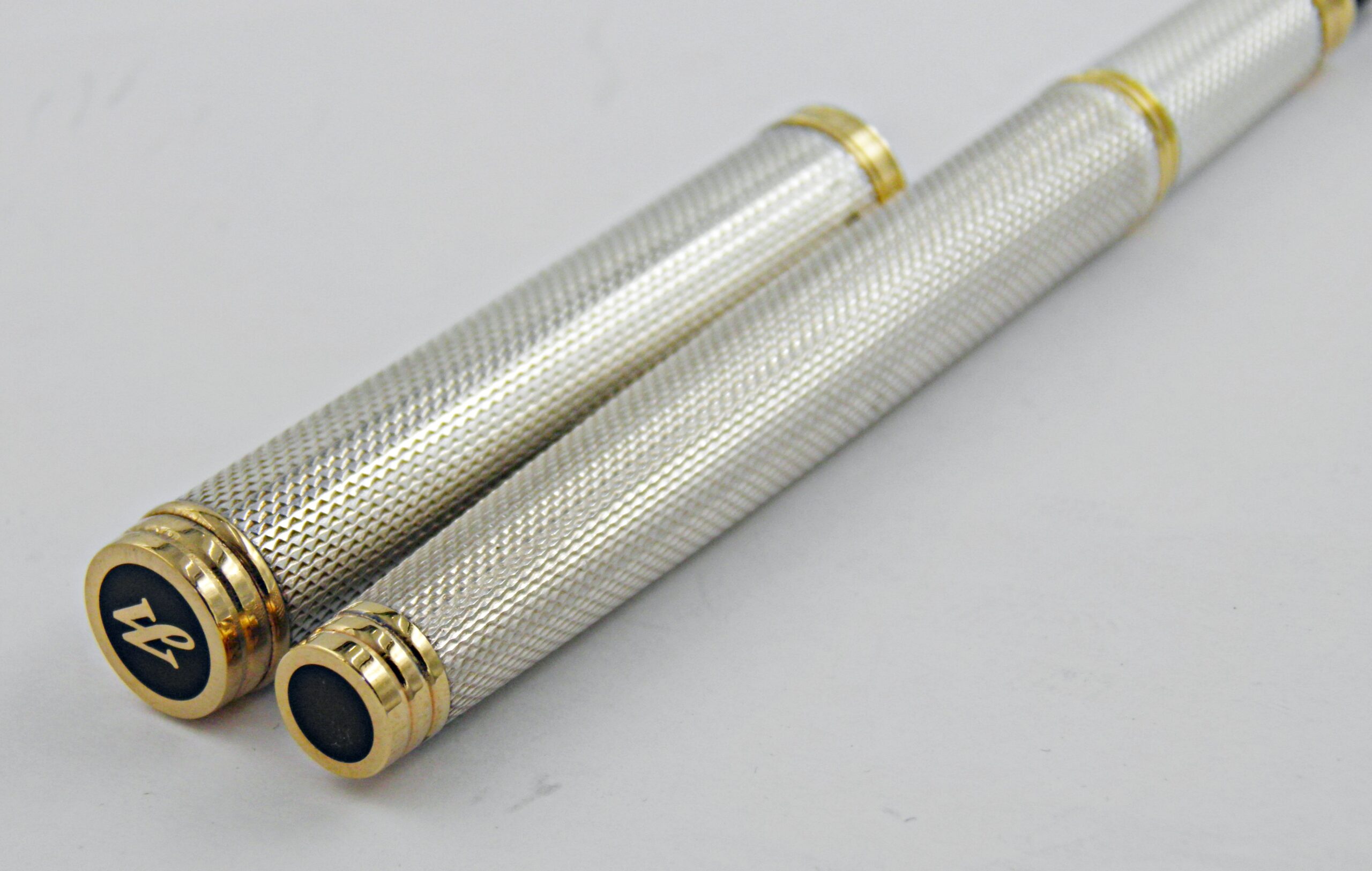Une superbe parure Waterman en argent massif et motifs grains d’orge, ce sont des modèles Gentleman, un stylo plume et son porte mines (0,7mm) à l’état neuf. Une parure rare dans cet état, les poinçons argent sont présent sur les deux stylos. La plume Waterman Idéal est en or 18k de taille extra fine. Un modèle des années 70’s.