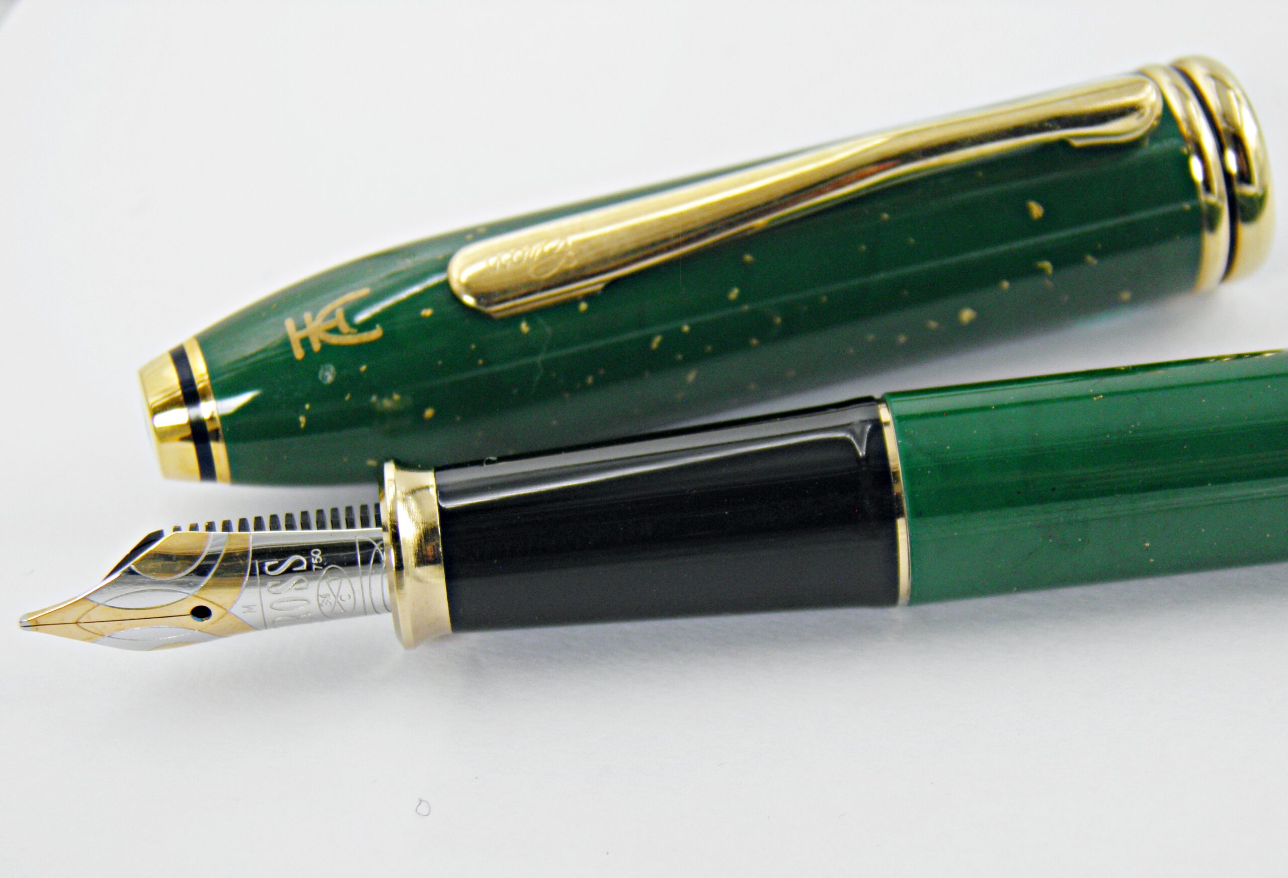 Un grand classique signé CROSS, le modèle Townsend a été décliné dans différents habillages, celui ci est laqué vert jade et paillettes d’or 24k. Dans les années 90’s Cross décide de sublimer la collection Townsend en sortant deux versions laquées d’exceptions. Une laque fabriquée à l’aide de poudre de pierres semi précieuses et des paillettes d’or 24k.. Il a une plume en or 18k de taille moyenne, il sera livré dans son écrin Cross et avec son Converter. Un exemplaire particulièrement rare dans cet état neuf ( aucune marque, juste des reflets du flash). Vous remarquerez le sigle Chinois symbole de la pierre de Jade.