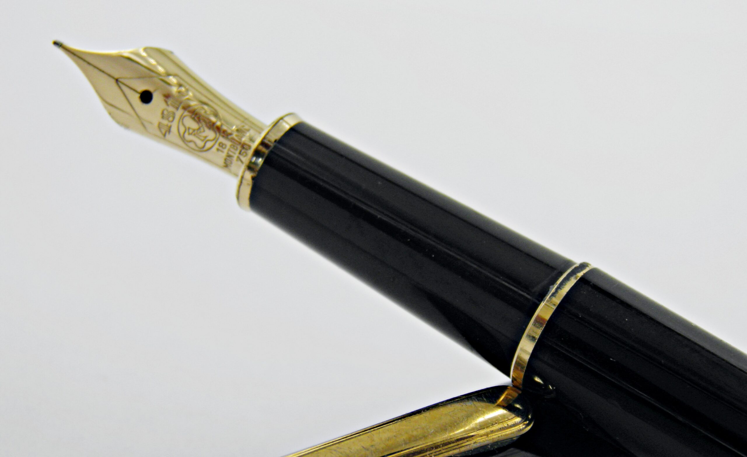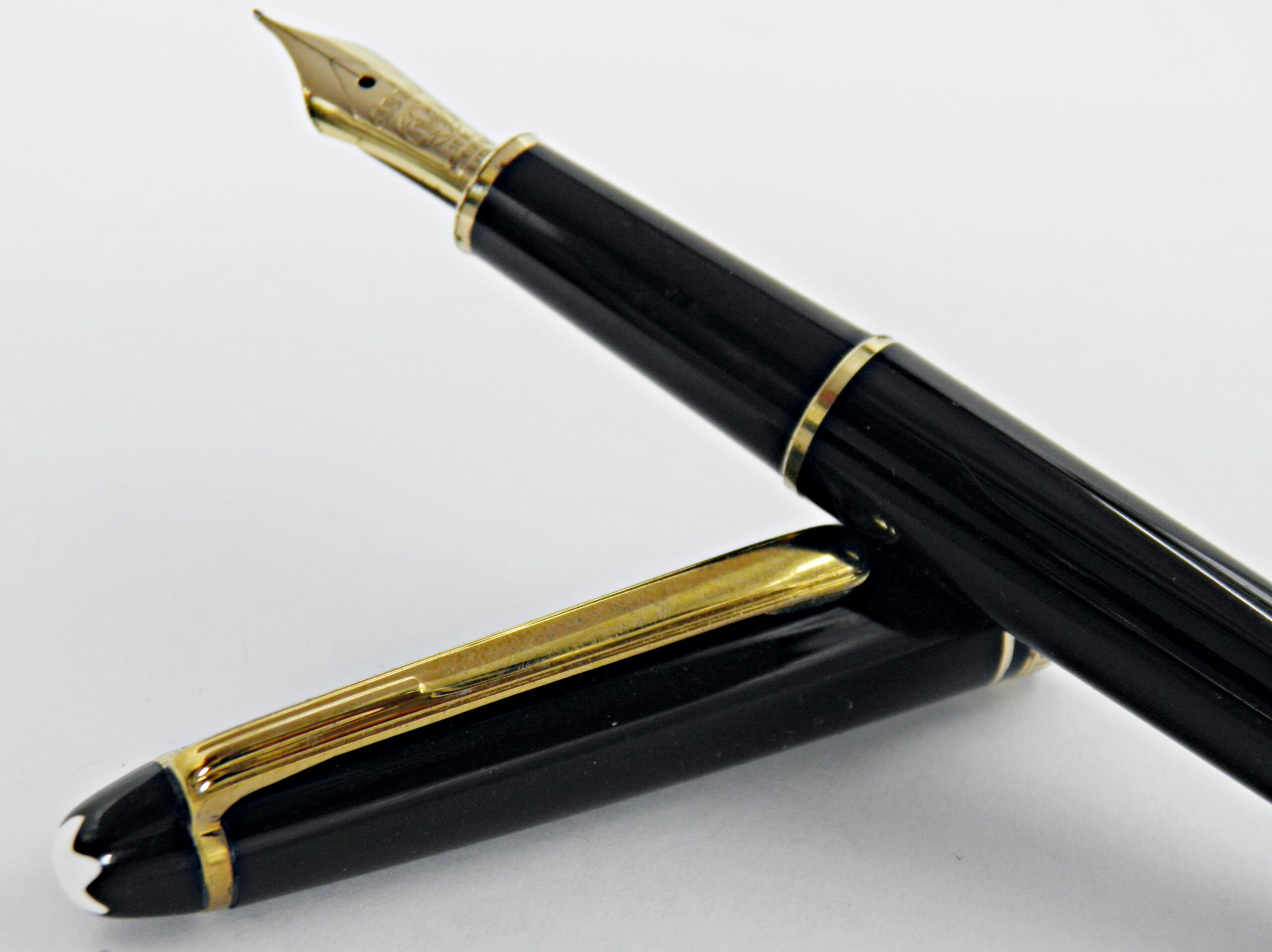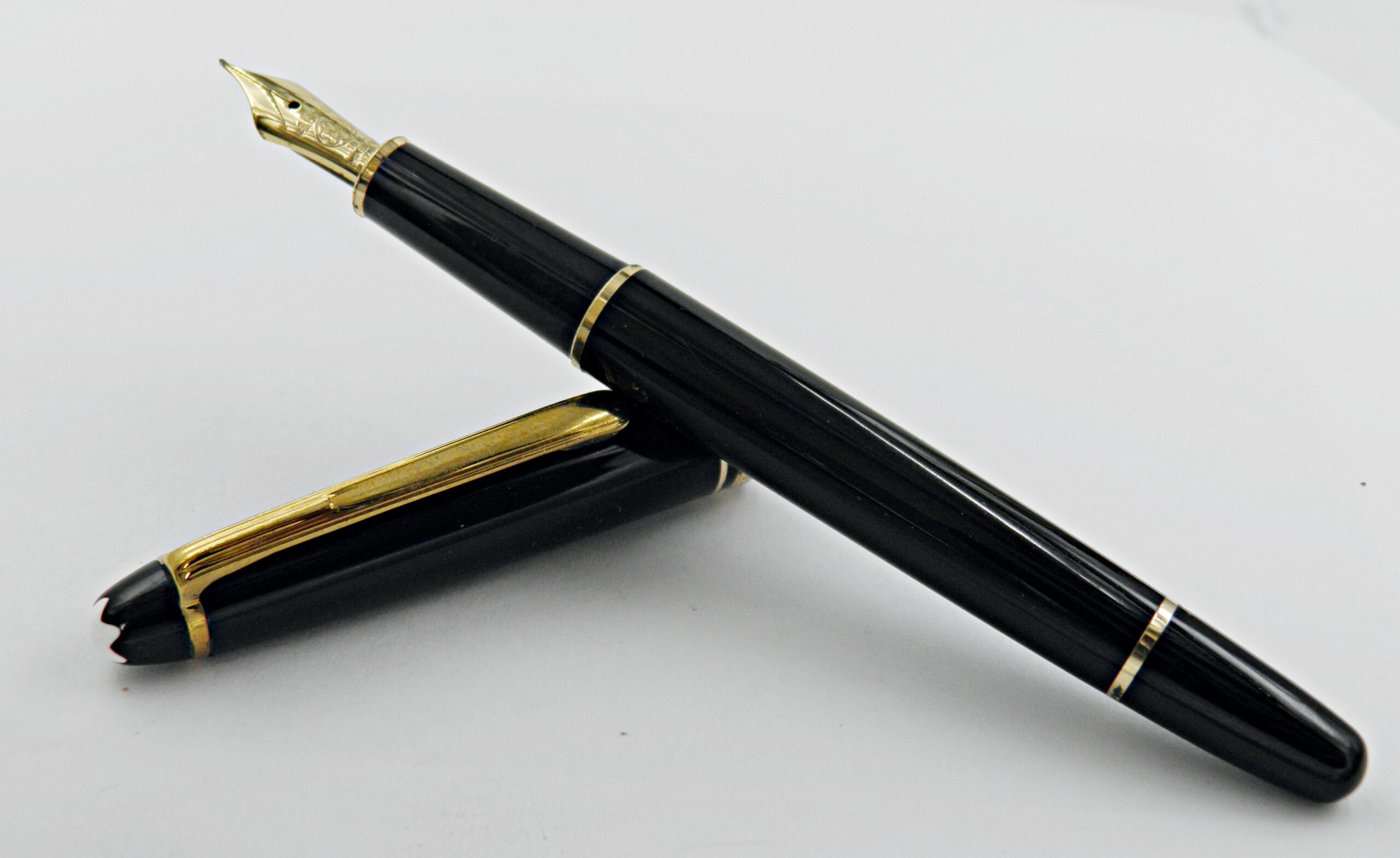 Un grand classique, c’est le modèle de stylo plume MONTBLANC 144 en résine noire. C’est le plus petit modèle après la collection Mozart. il a une plume 4810 en or 18k bicolore de taille fine, très agréable. Il fonctionne à l’aide de cartouches. Il est en bon état général.