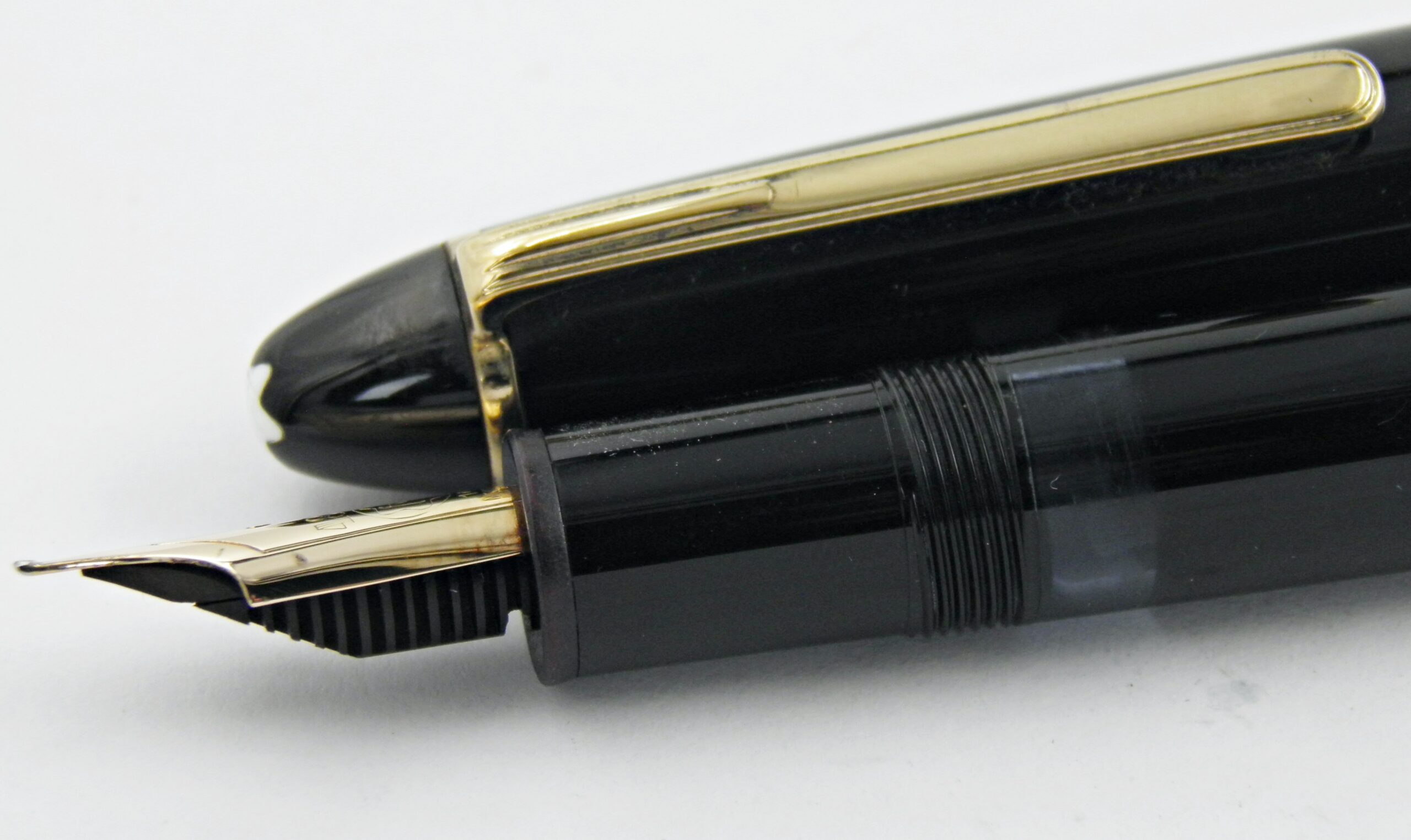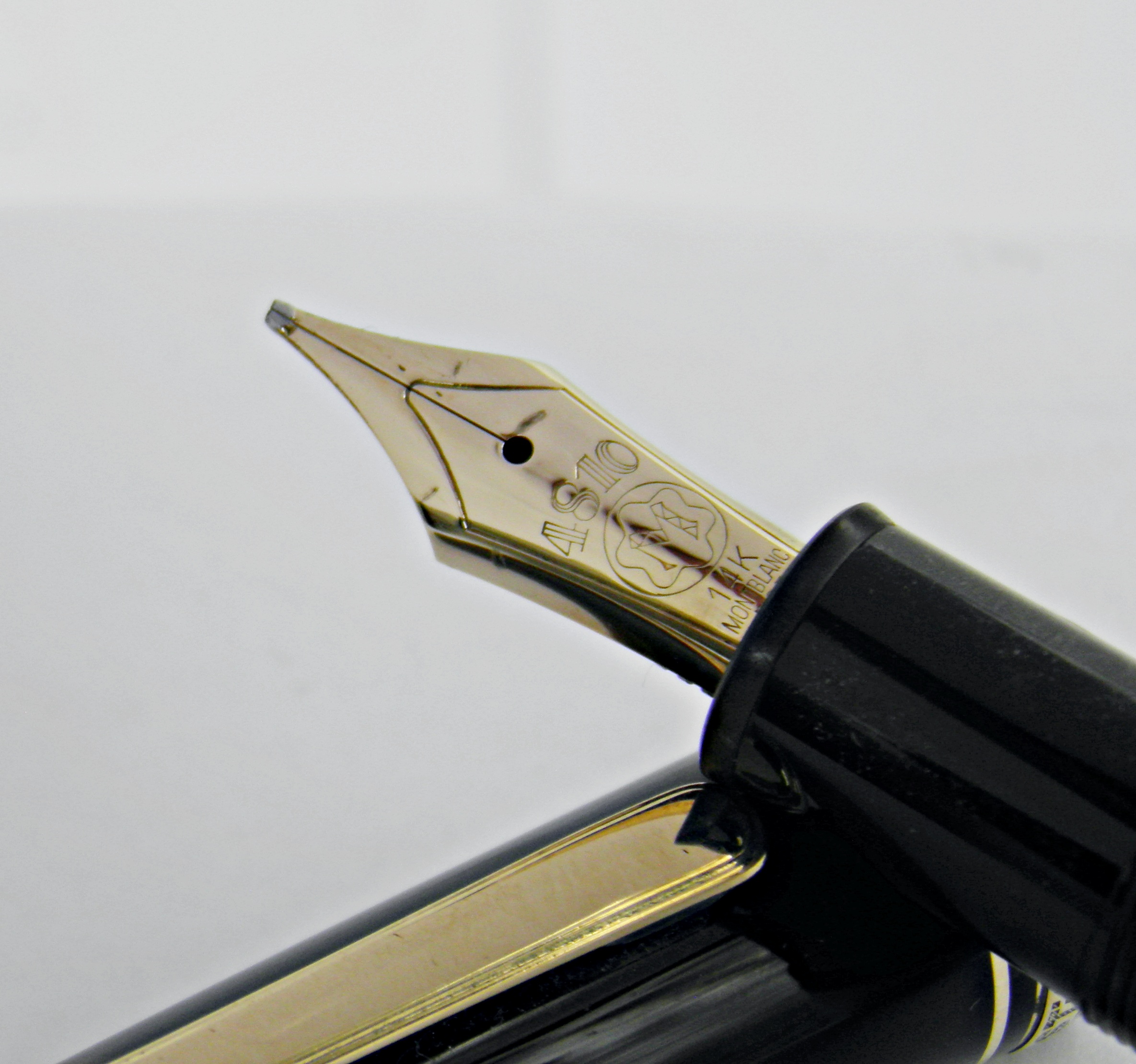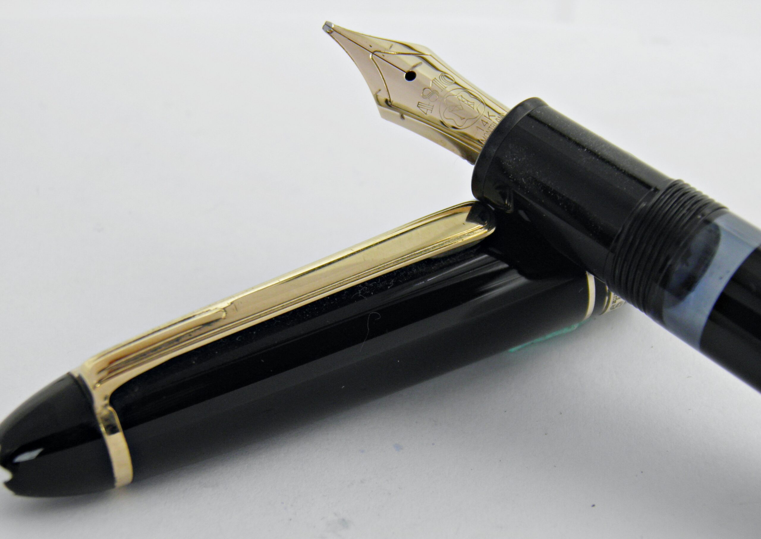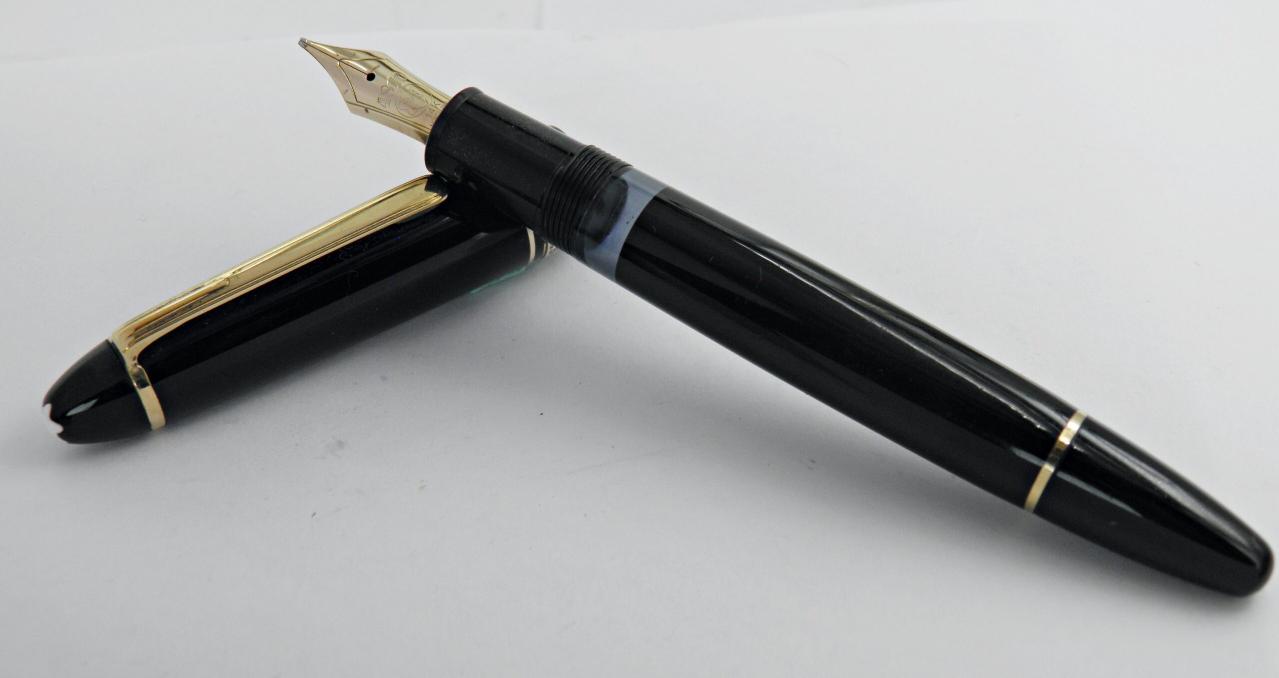 Un grand classique signé Montblanc, c’est un modèle 146, une taille intermédiaire entre le 149 et le Montblanc classique.  La numérotation 146 et  149, correspond à : le 1 pour stylo plume Meisterstuck, le 4 pour système à piston et le dernier chiffre pour la taille de la plume. Il est en excellent état d’aspect et de fonctionnement. Il a une belle plume en or 14k de taille OB (oblique large) très douce sur le papier. Son système d’alimentation par piston est en parfait état. Un stylo prêt à servir tous les jours.