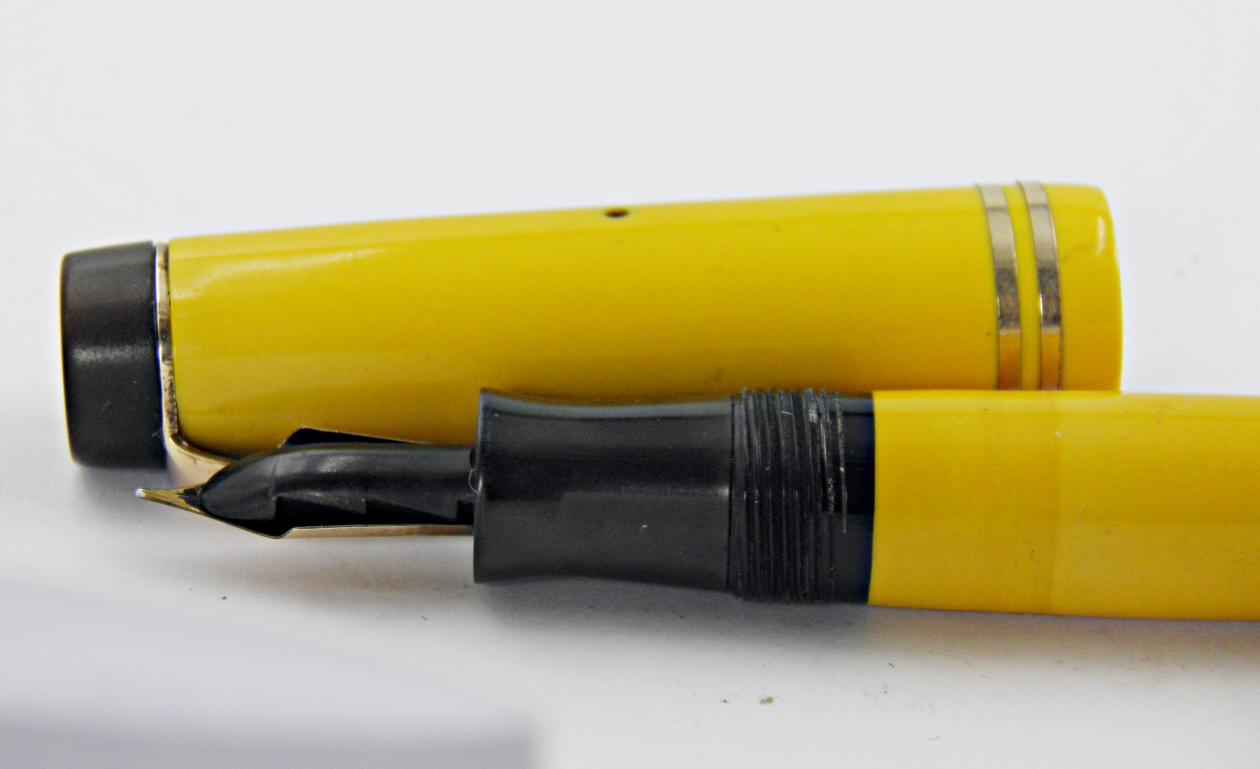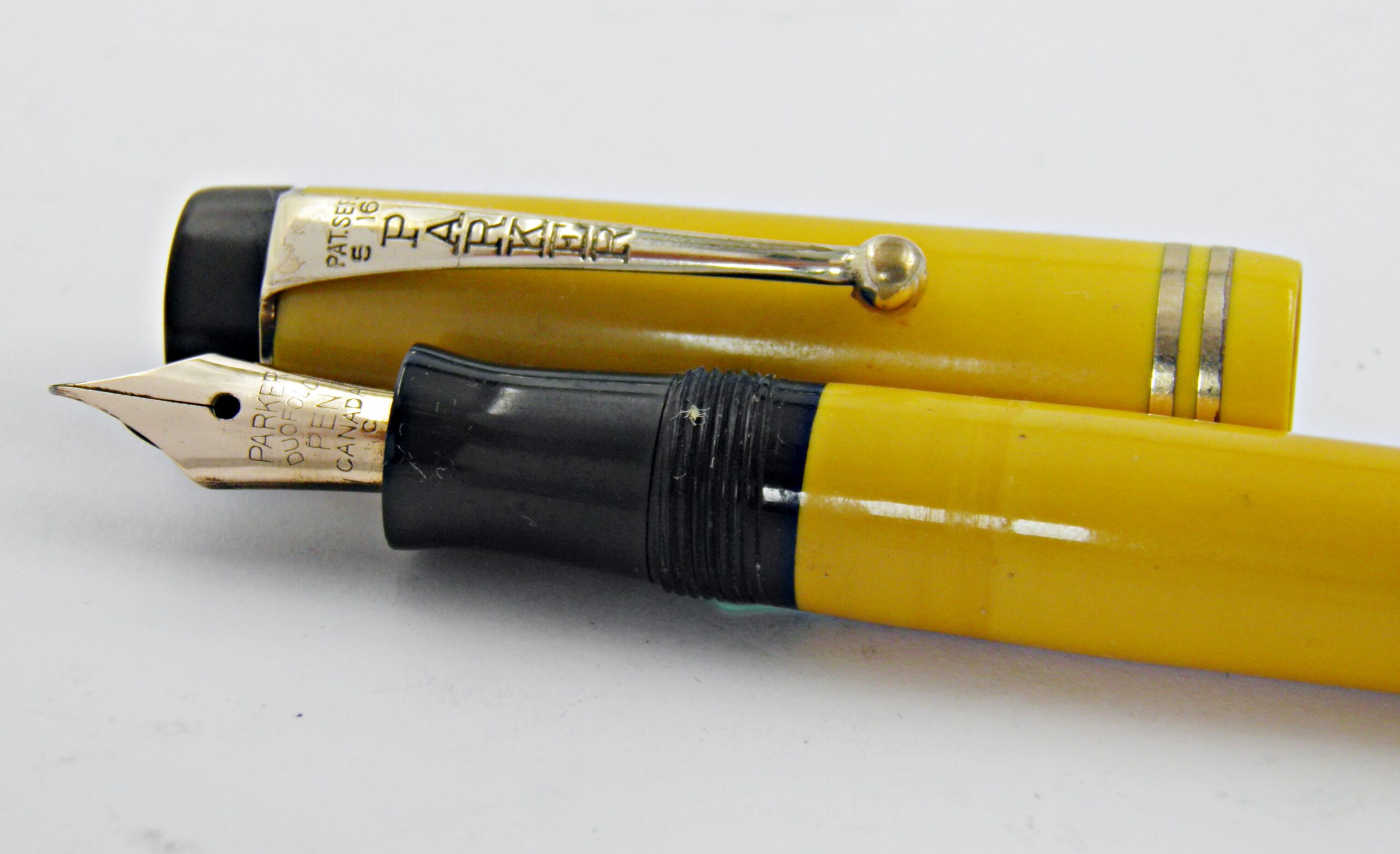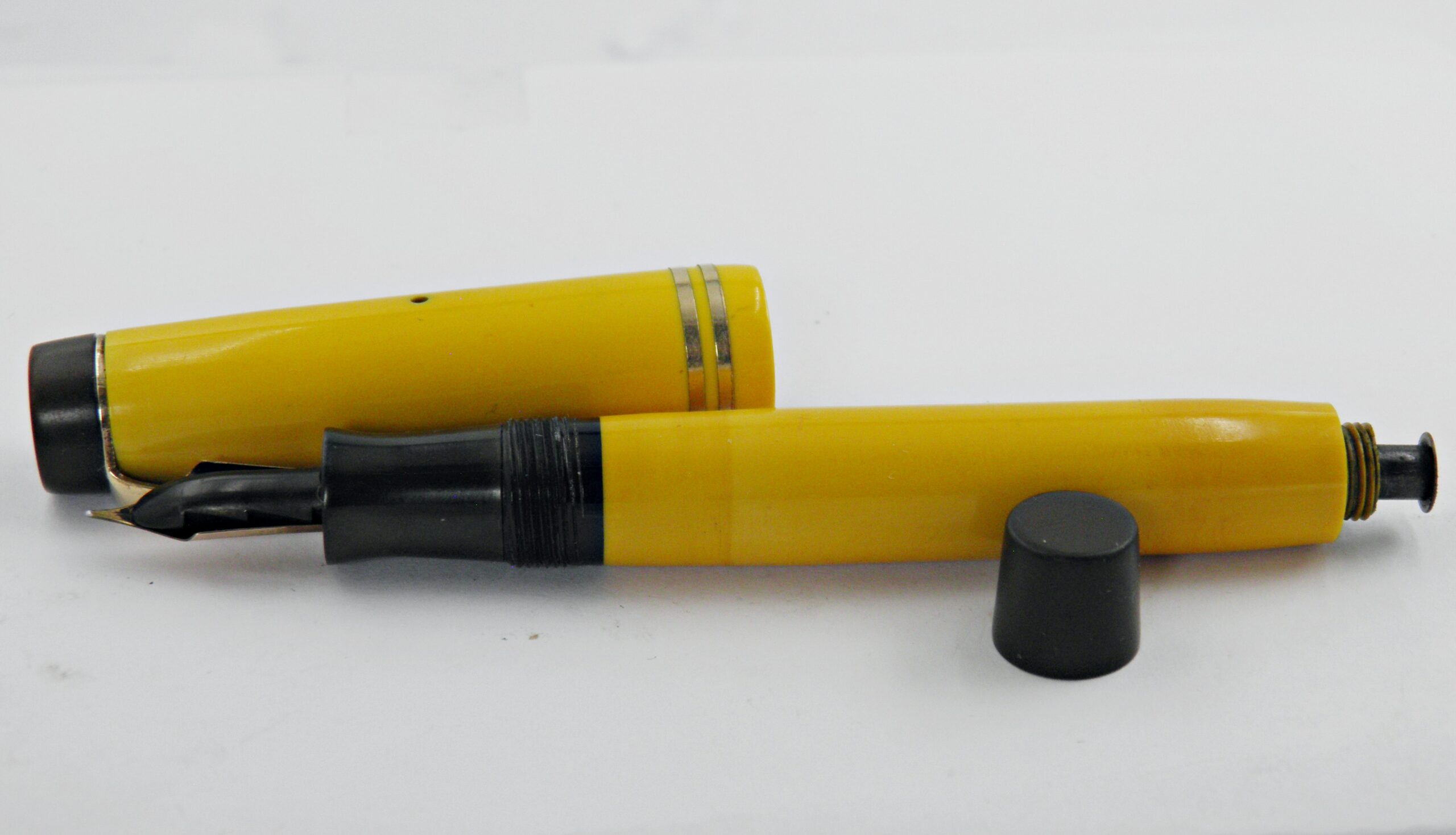 Rare Parker Duofold junior de couleur jaune, c’est le modèle Mandarin, il a été fabriqué durant les années 20’s.  les inscriptions sur le corps sont très effacées.  La plume or Parker Duofold est de taille fine, très agréable . Le système d’alimentation Lucky curve est en parfait état et le sac réservoir est neuf. Un Grall pour les collectionneurs.