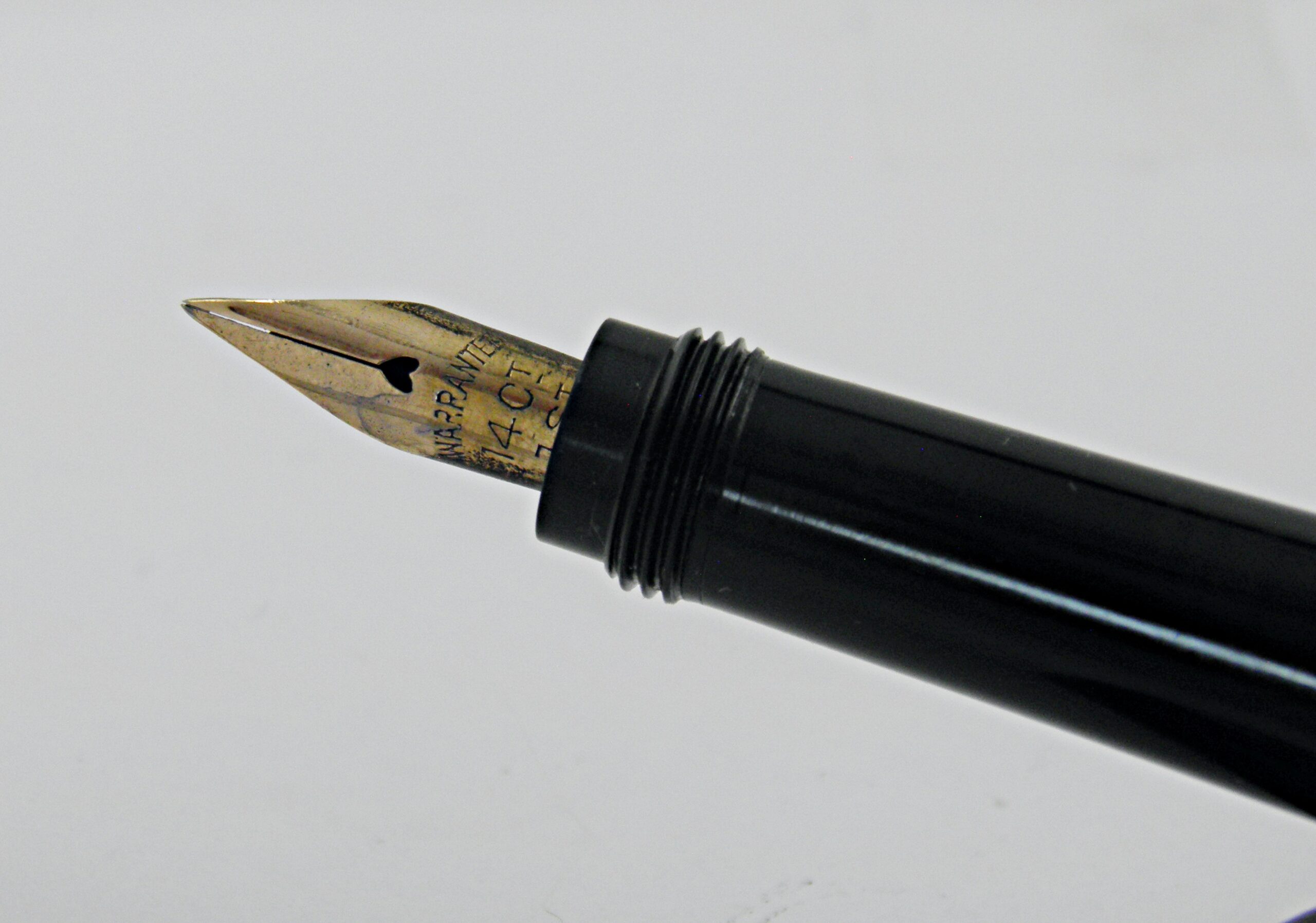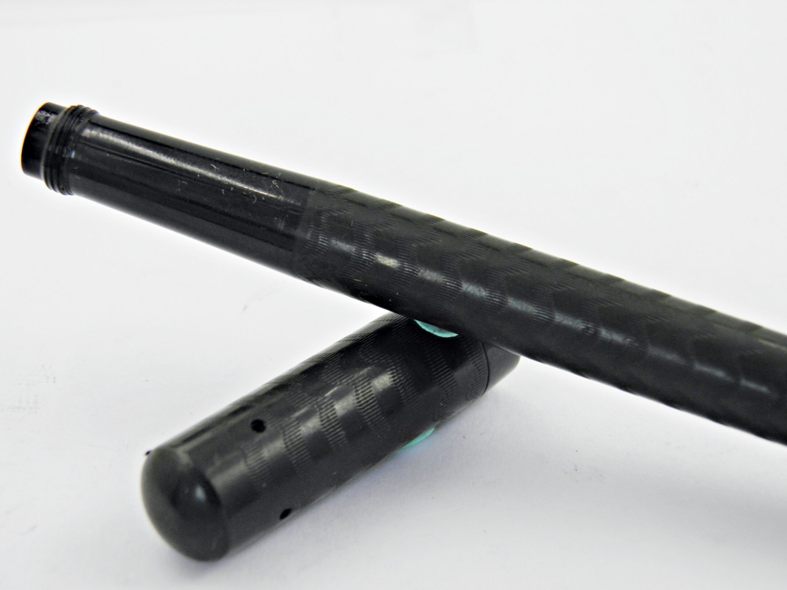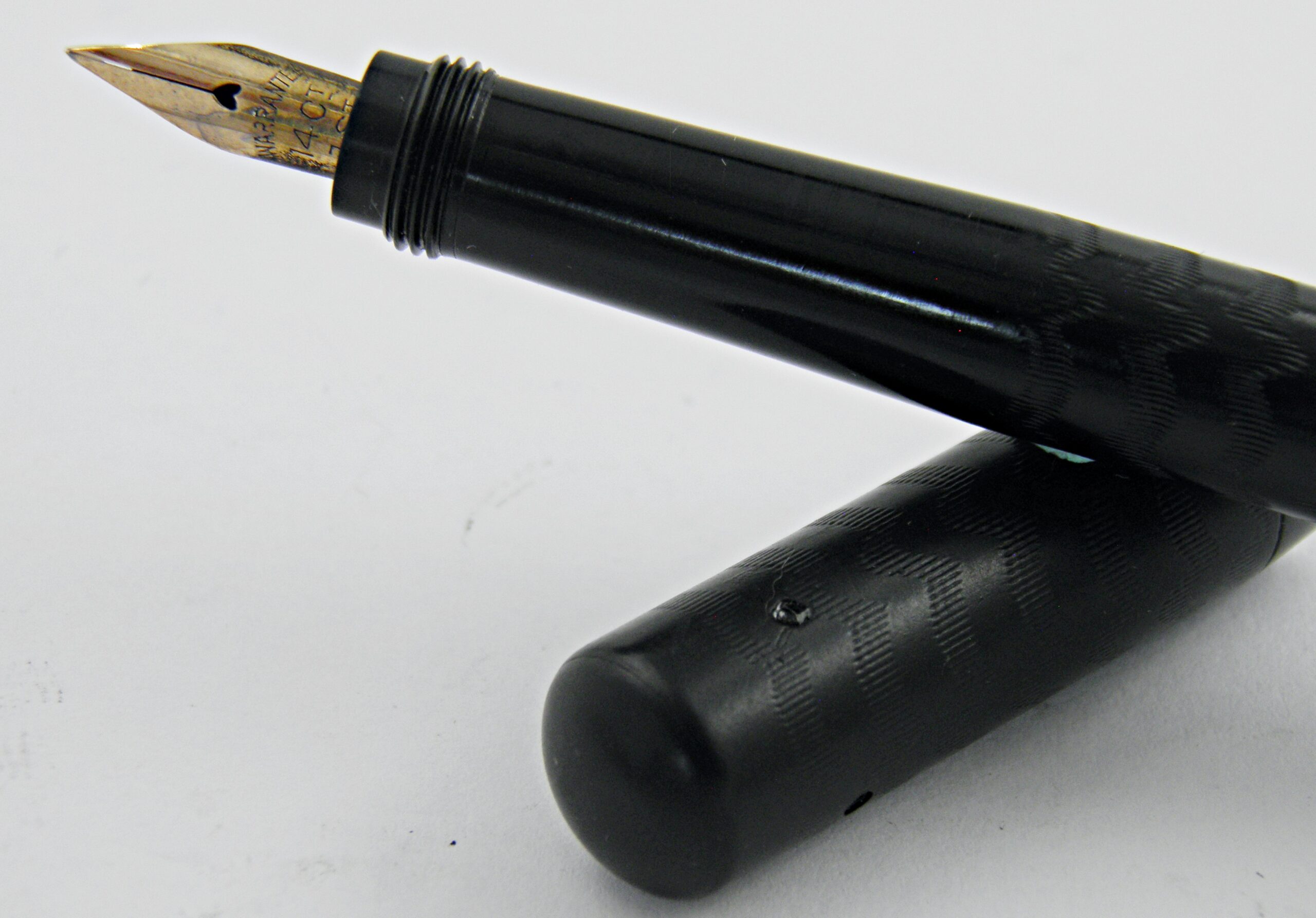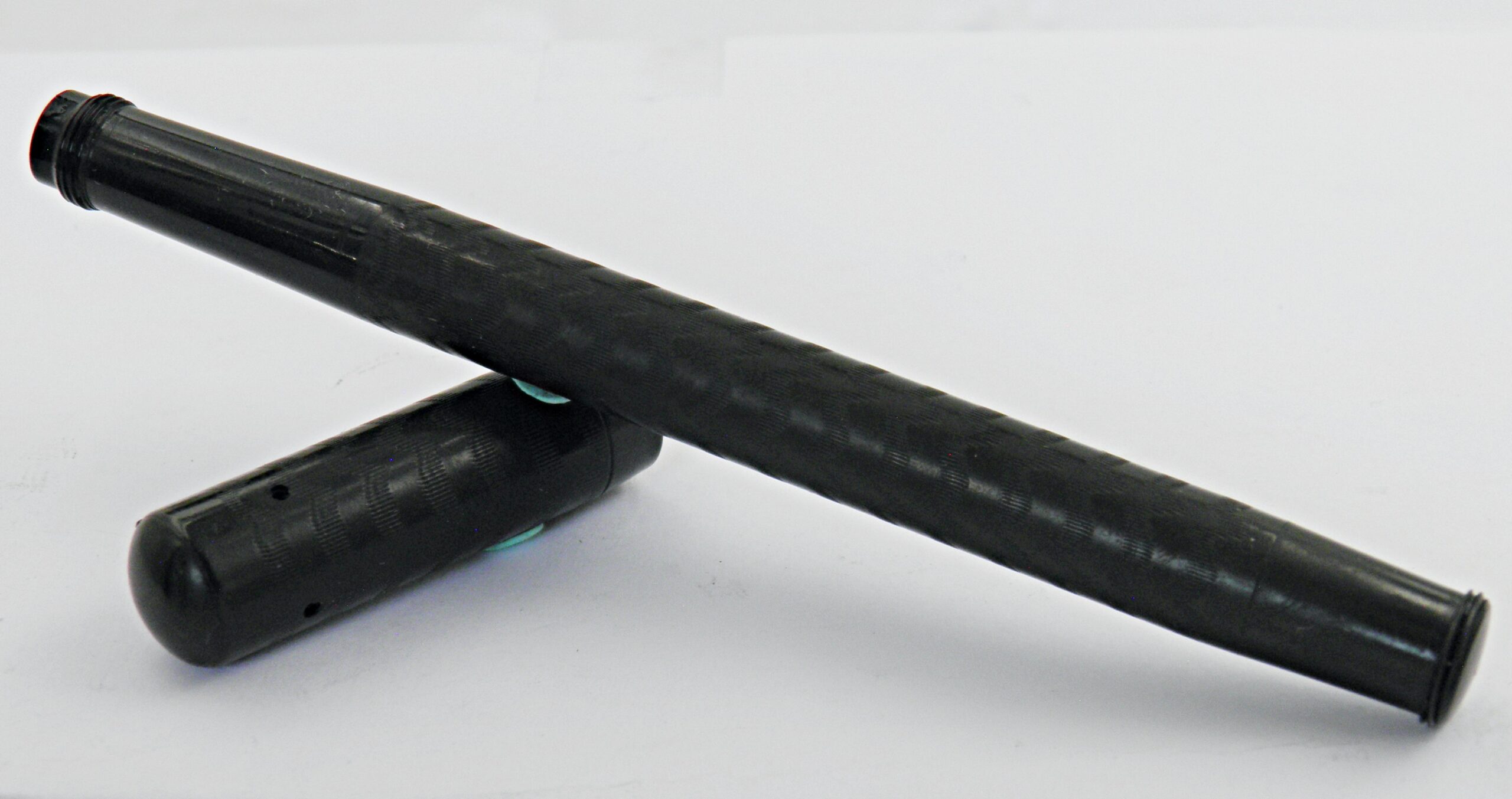 Superbe et rare stylo plume rentrante du fabricant BÖLHER, c’est un modèle n° 65 en ébonite noire et motifs chased datant des années 20’s. Il est long et fin, les motifs sont superbes. Il a une plume or 14k de taille moyenne. Pour faire sortir et faire rentrer la plume, il suffit de mettre le capuchon au cul et cela facilité l’entrée et sortie de plume. Une belle pièce !