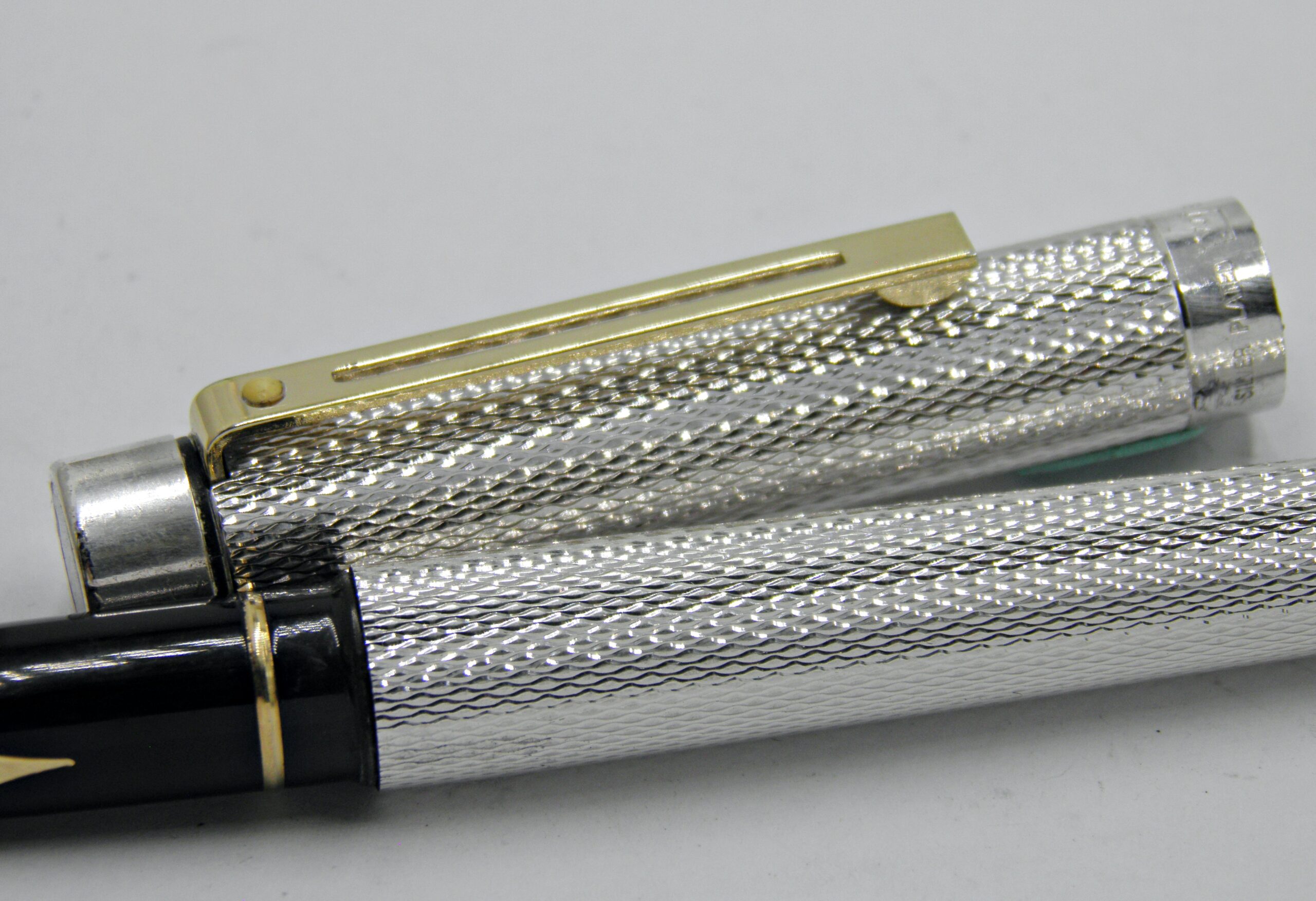 Un grand classique de la marque Sheaffer, c’est le modèle Targa datant de la fin des années 70’s début 80’s. Il est plaqué argent et motifs Grains d’Orge. Il est en excellent état, proche du neuf, il est équipé du converter Sheaffer et sa plume intégrée est en or 18k de taille moyenne , belle pièce !!