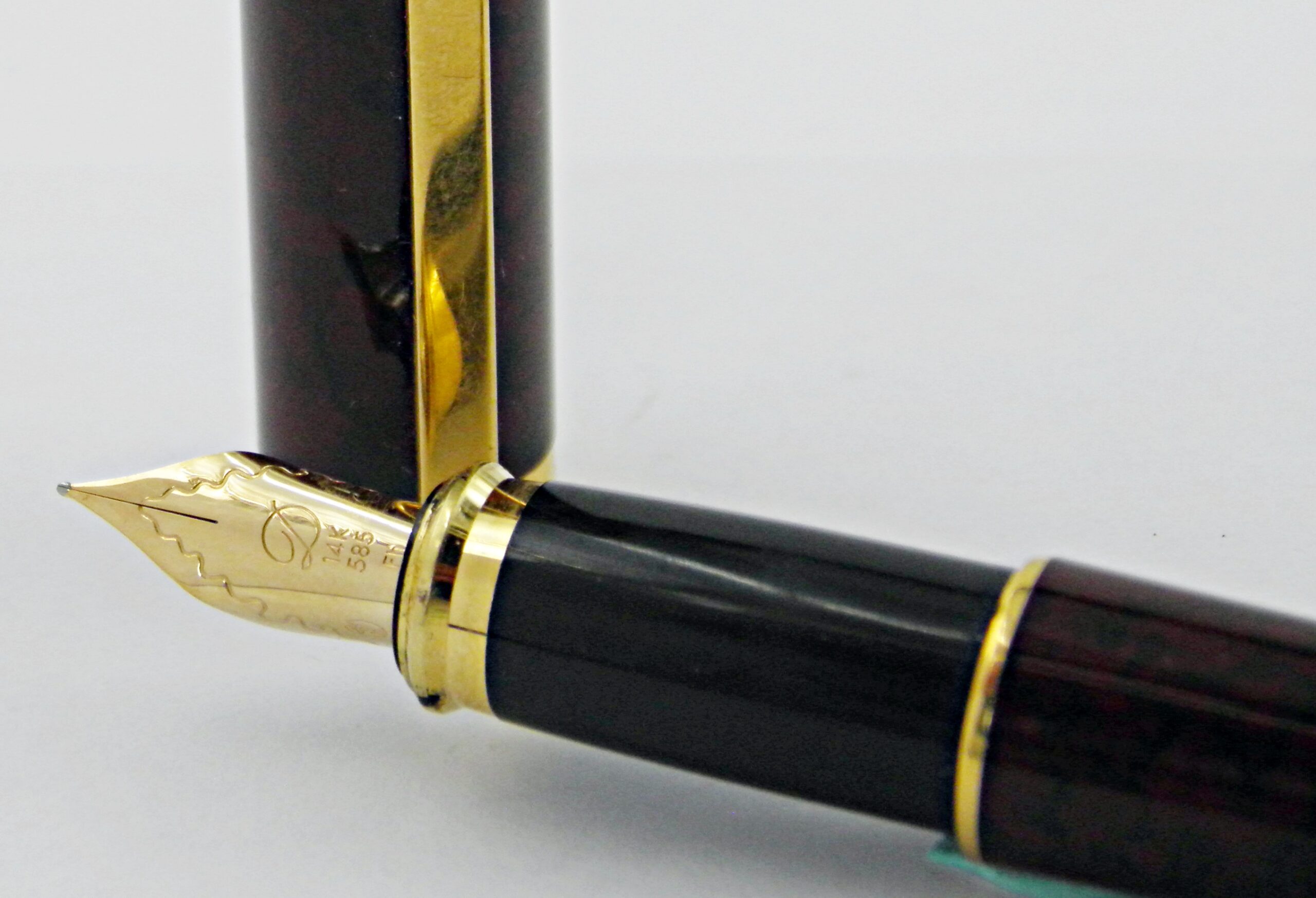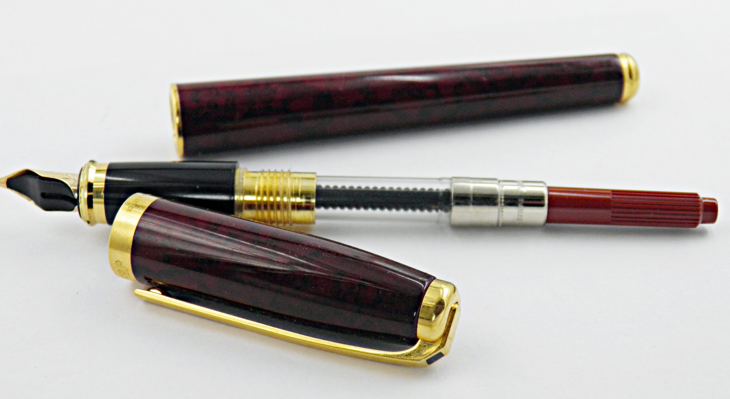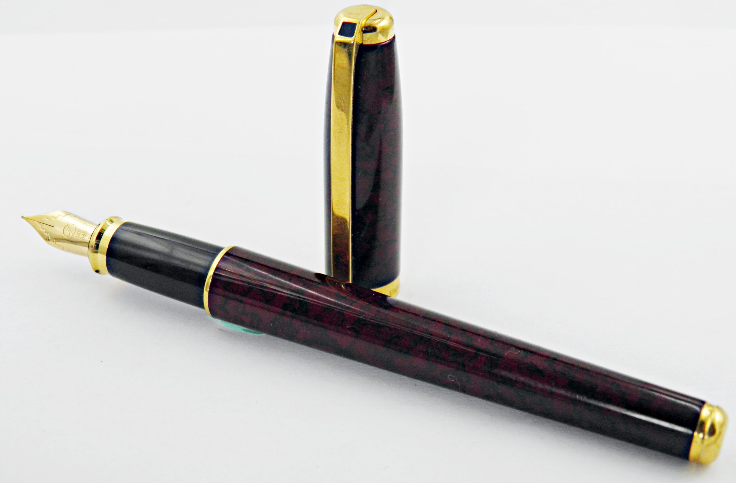Un grand classique de la marque ST DUPONT, c’est le modèle FIDELIO, un assez gros stylo. Son corps est superbe avec cette magnifique bordeaux irisée noire et son petit carré noir en pierre d’onyx. Il a une belle plume en or 14k de taille fine très agréable sur le papier. Il est livré avec son converter, un exemplaire dans un état neuf. Difficile de bien rendre l’aspect de la laque en photos.