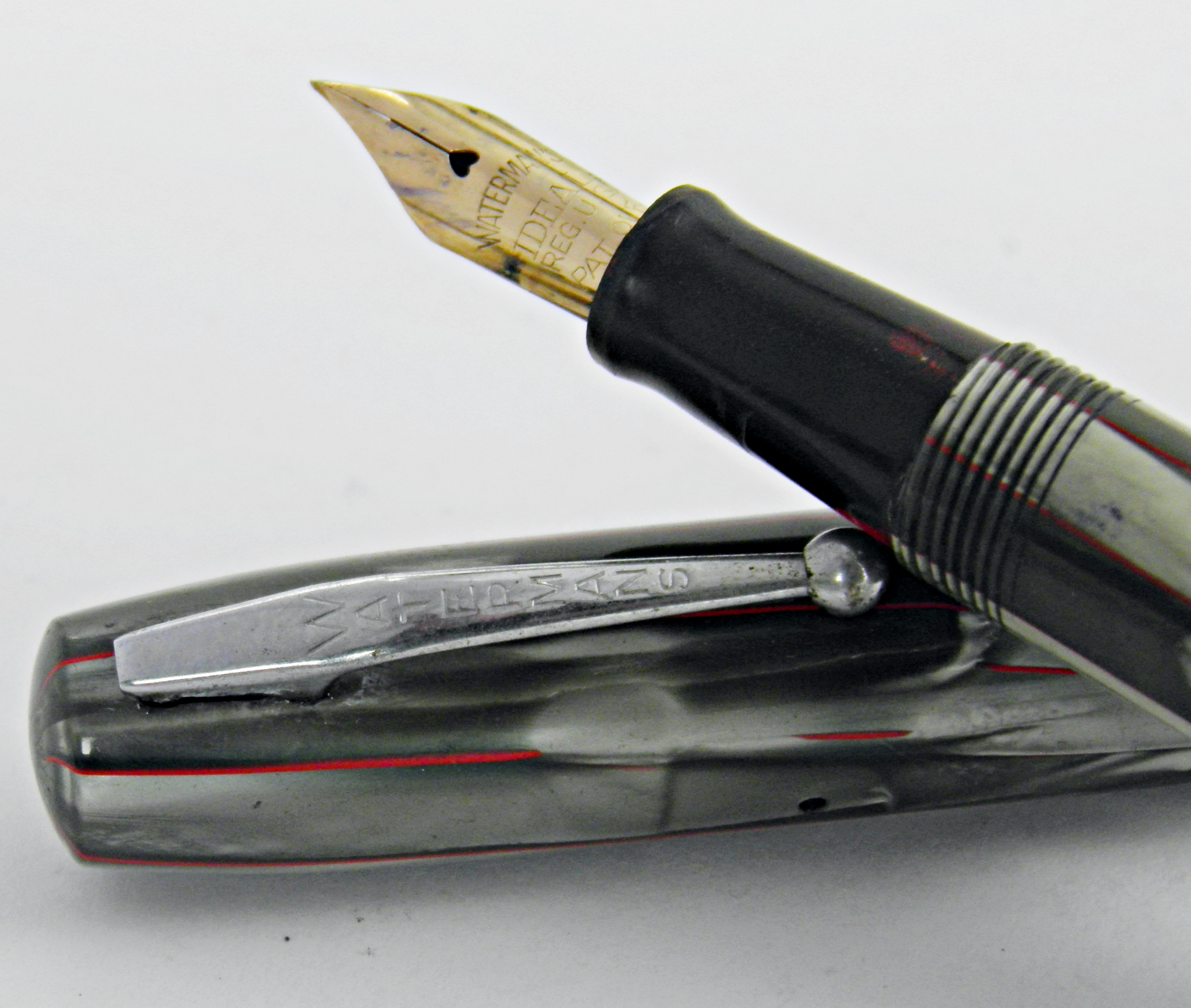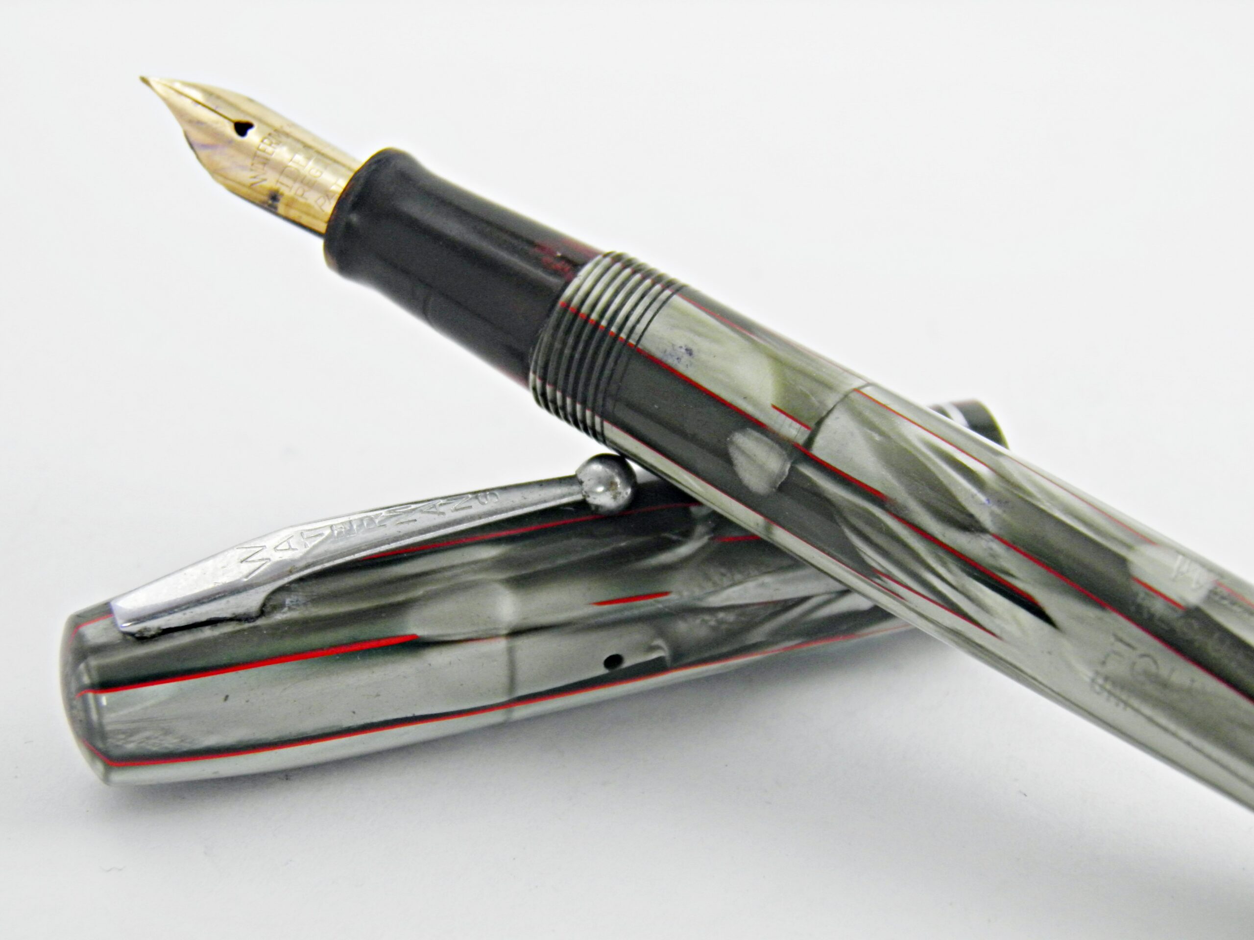 Superbe stylo plume WATERMAN datant des années 40’s, c’est un modèle 301 à levier. Son celluloïd gris, rouge est magnifique. Il a une plume Waterman en or 18k de taille fine très douce sur le papier. Un modèle en excellent état et prêt à servir tous les jours.