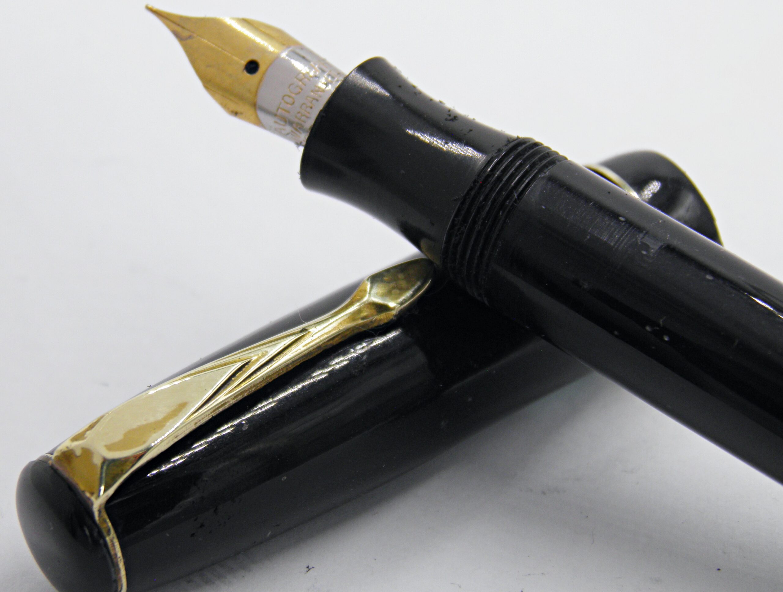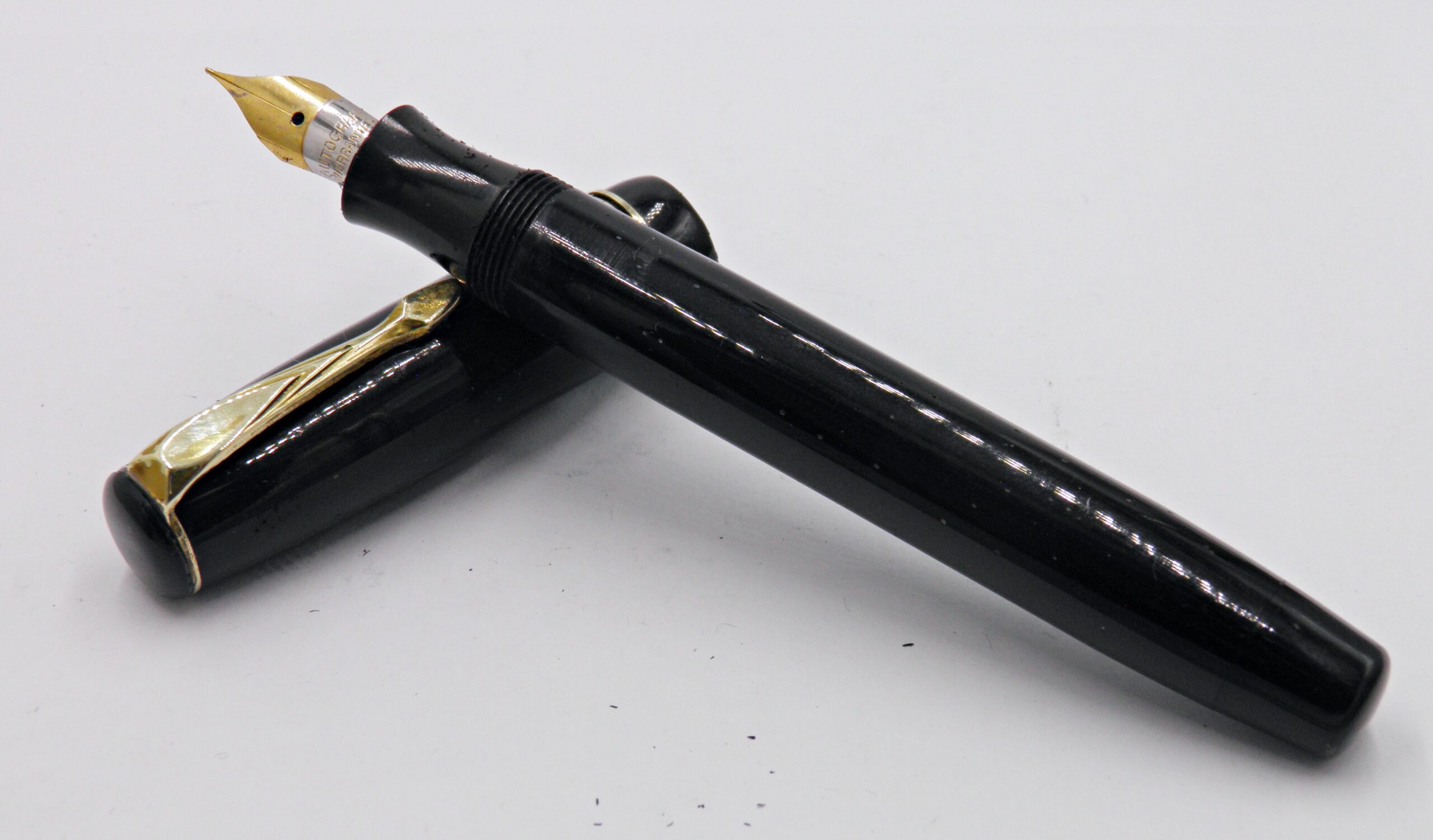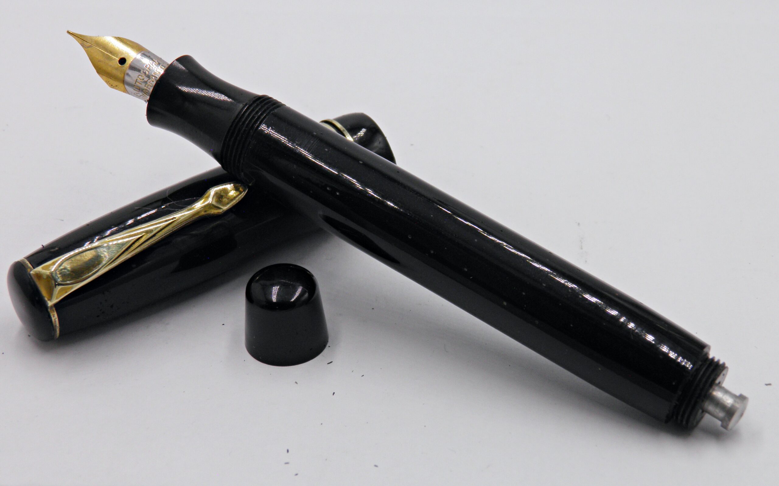 Un stylo plume d’un fabricant Anonyme datant des années 40’s. Il est en celluloïd noir et attributs plaqués or. Il a une plume de taille fine semi flexible. Son système d’alimentation se fait pas bouton poussoir, le sac est neuf. Un modèle en parfait état