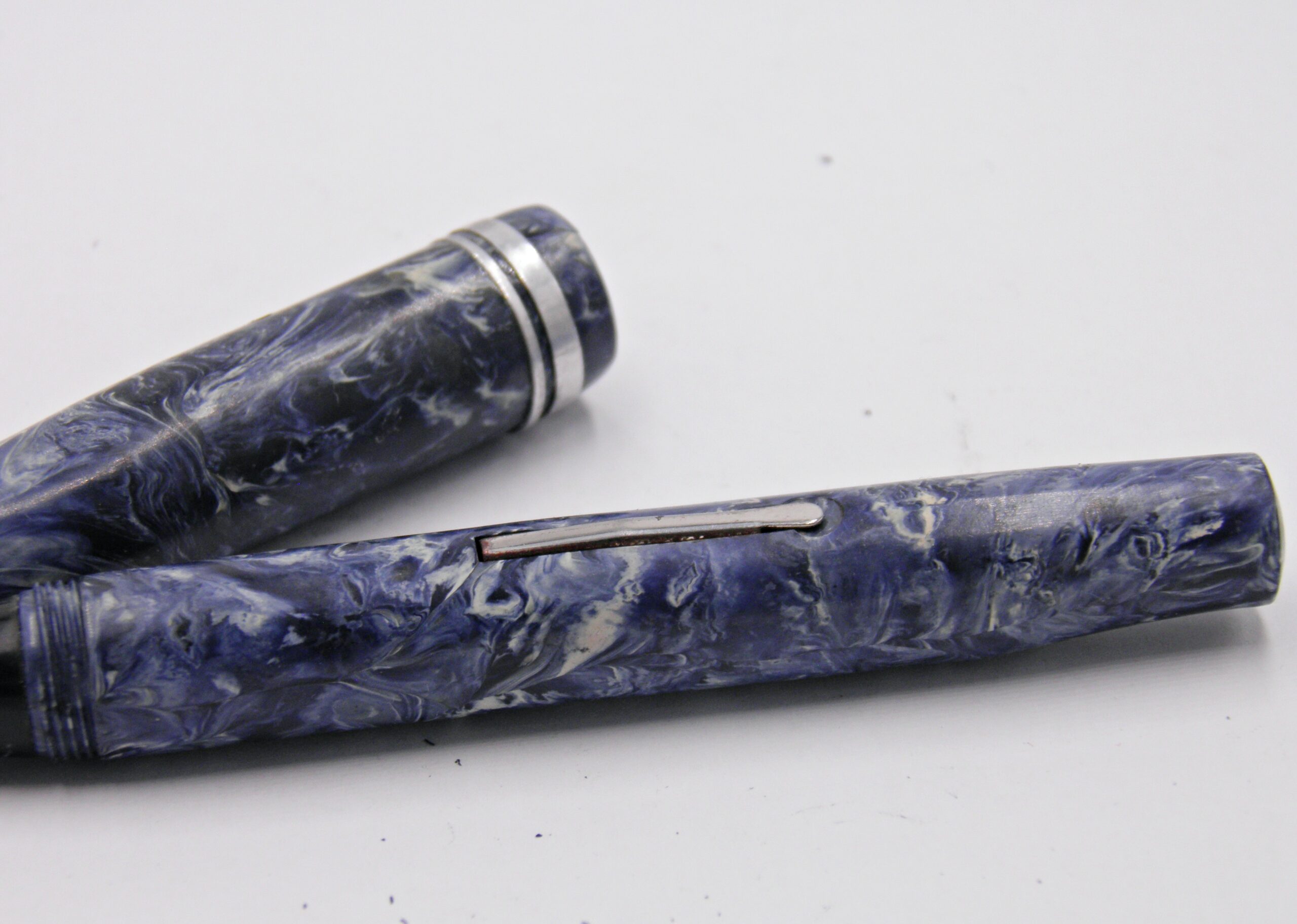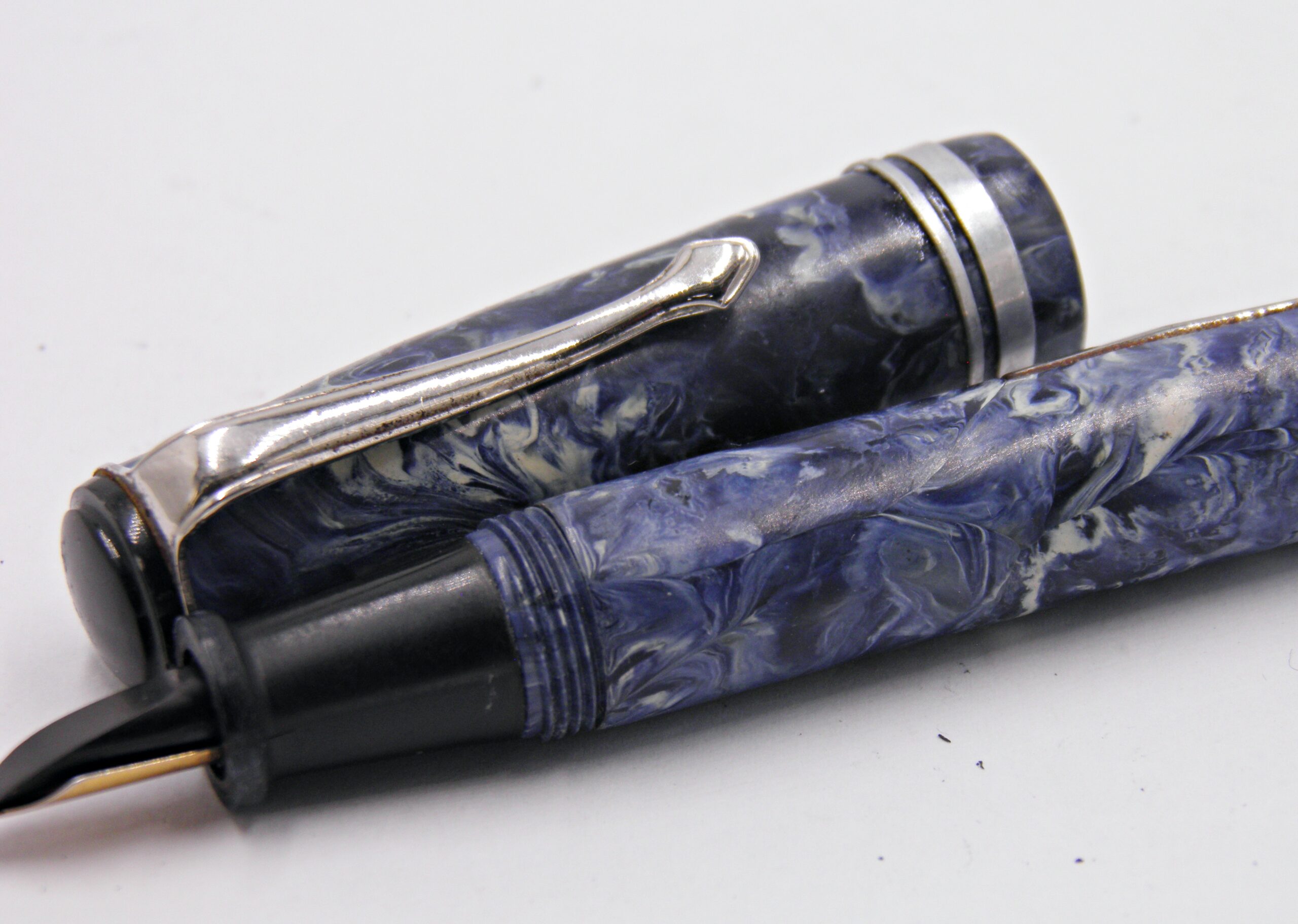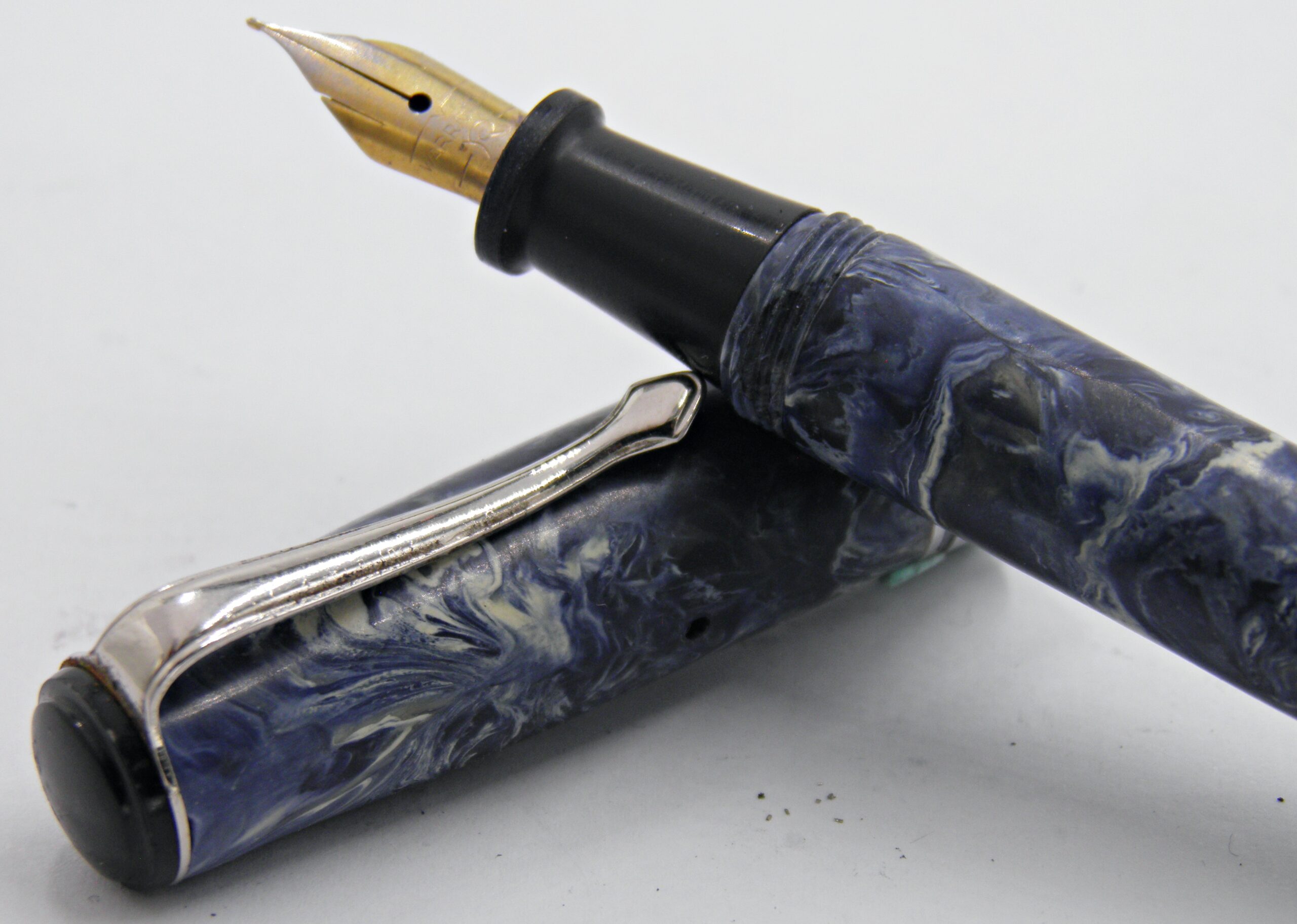 Un stylo plume d’un fabricant Anonyme datant des années 40’s. Il est dans une couleur de celluloïd peu courante, un bleu veiné blanc et attributs chrome. Il a une plume de taille moyenne et semi flexible. Son système d’alimentation se fait par levier, le sac est neuf. Un modèle en parfait état