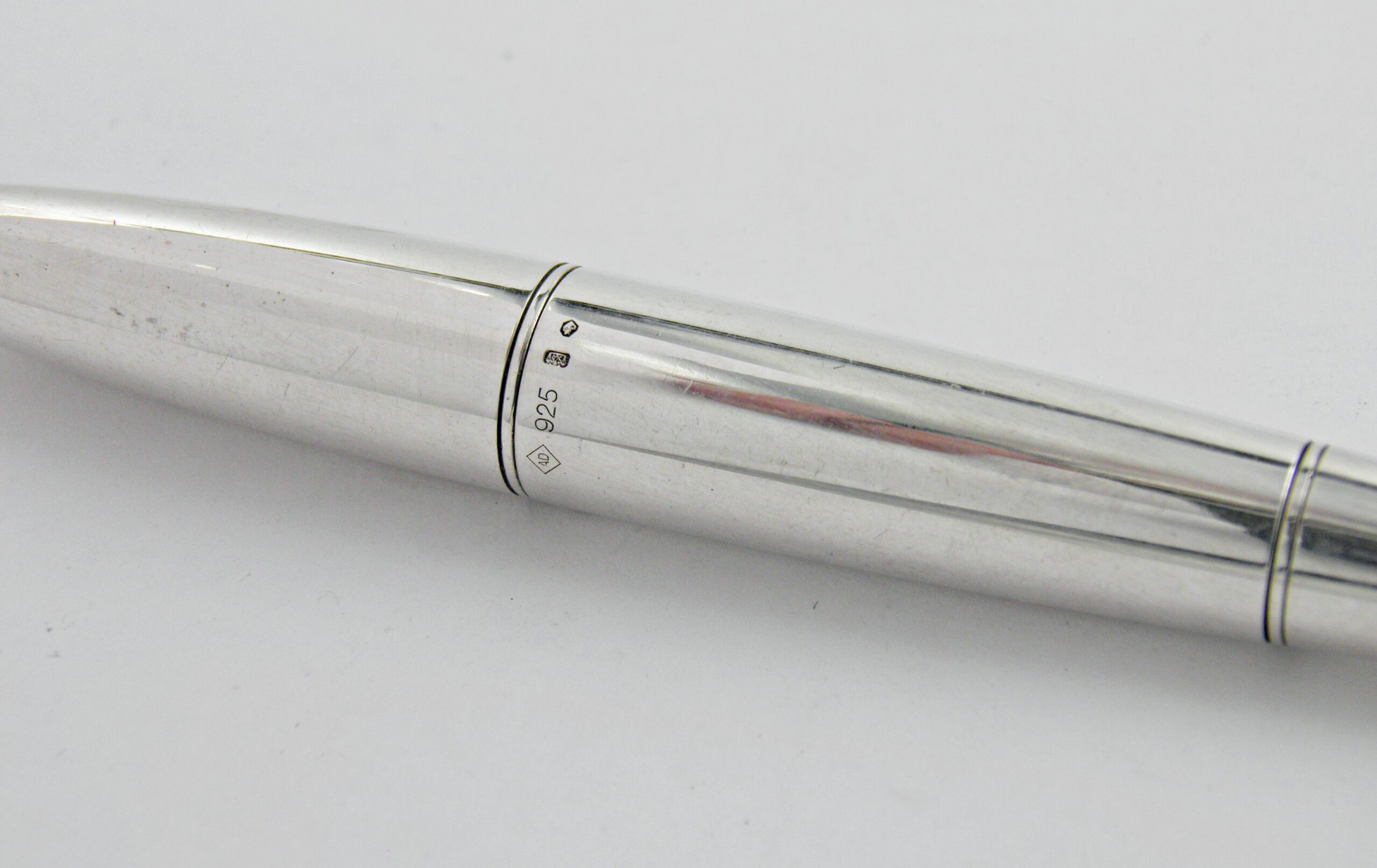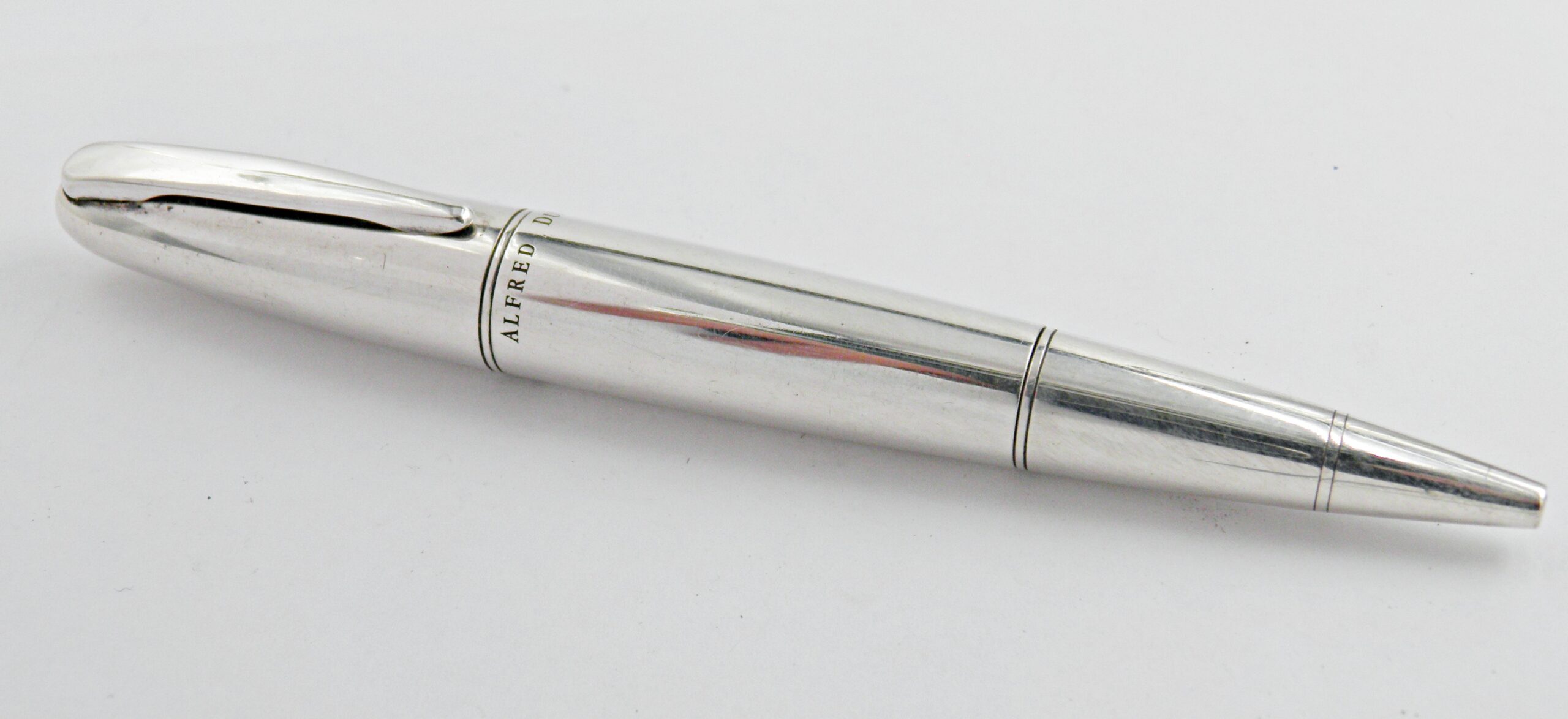 Très élégant modèle de stylo bille de la marque ALFRED DUNHILL, c’est un modèle TORPÉDO. Il est en argent massif et son système de sortie de bille est tournant. Il est en parfait état  (pas de choc ni rayure) et sera livré avec sa recharge neuve.