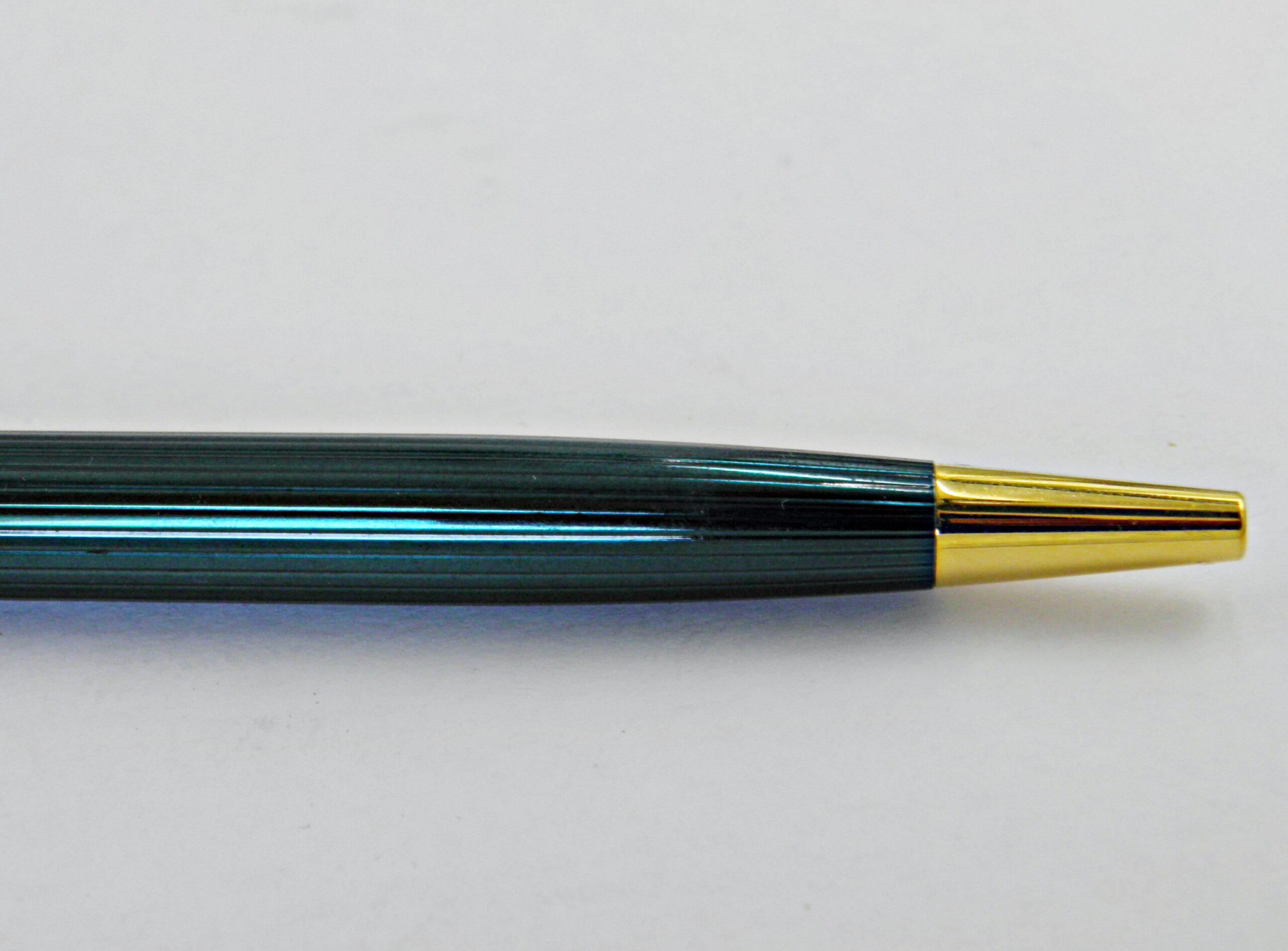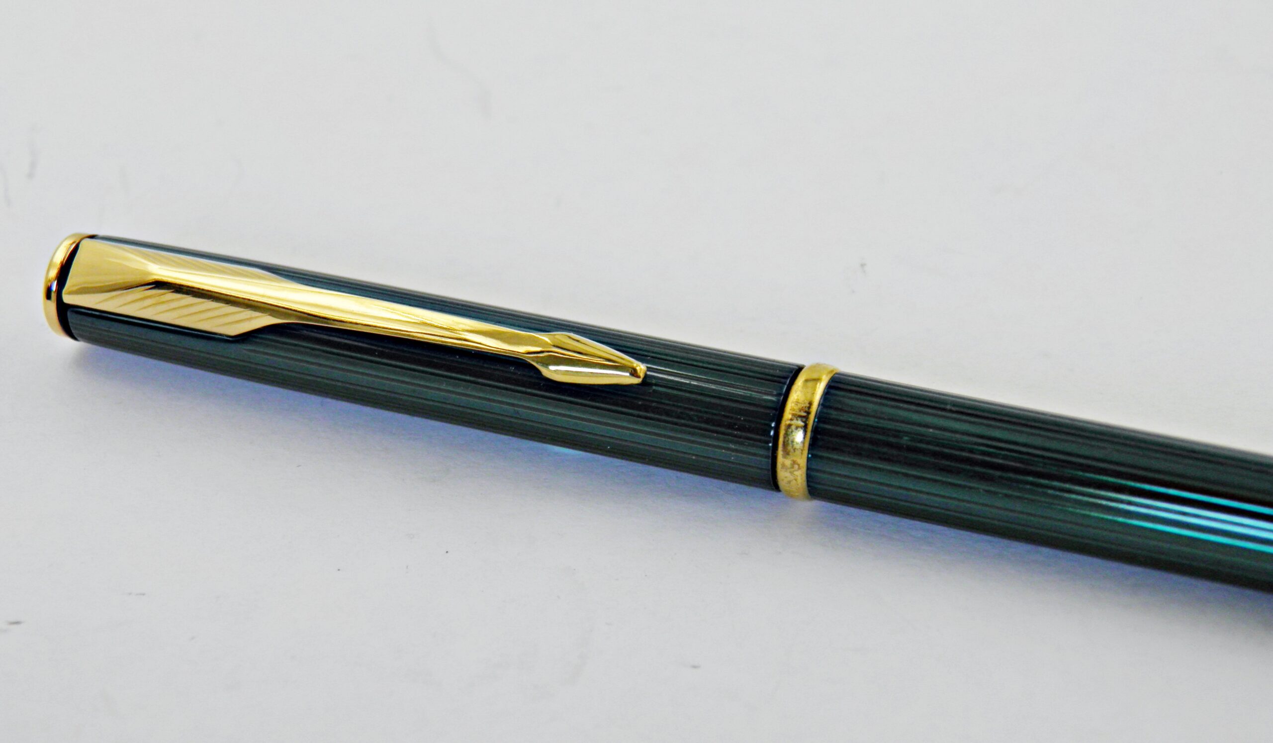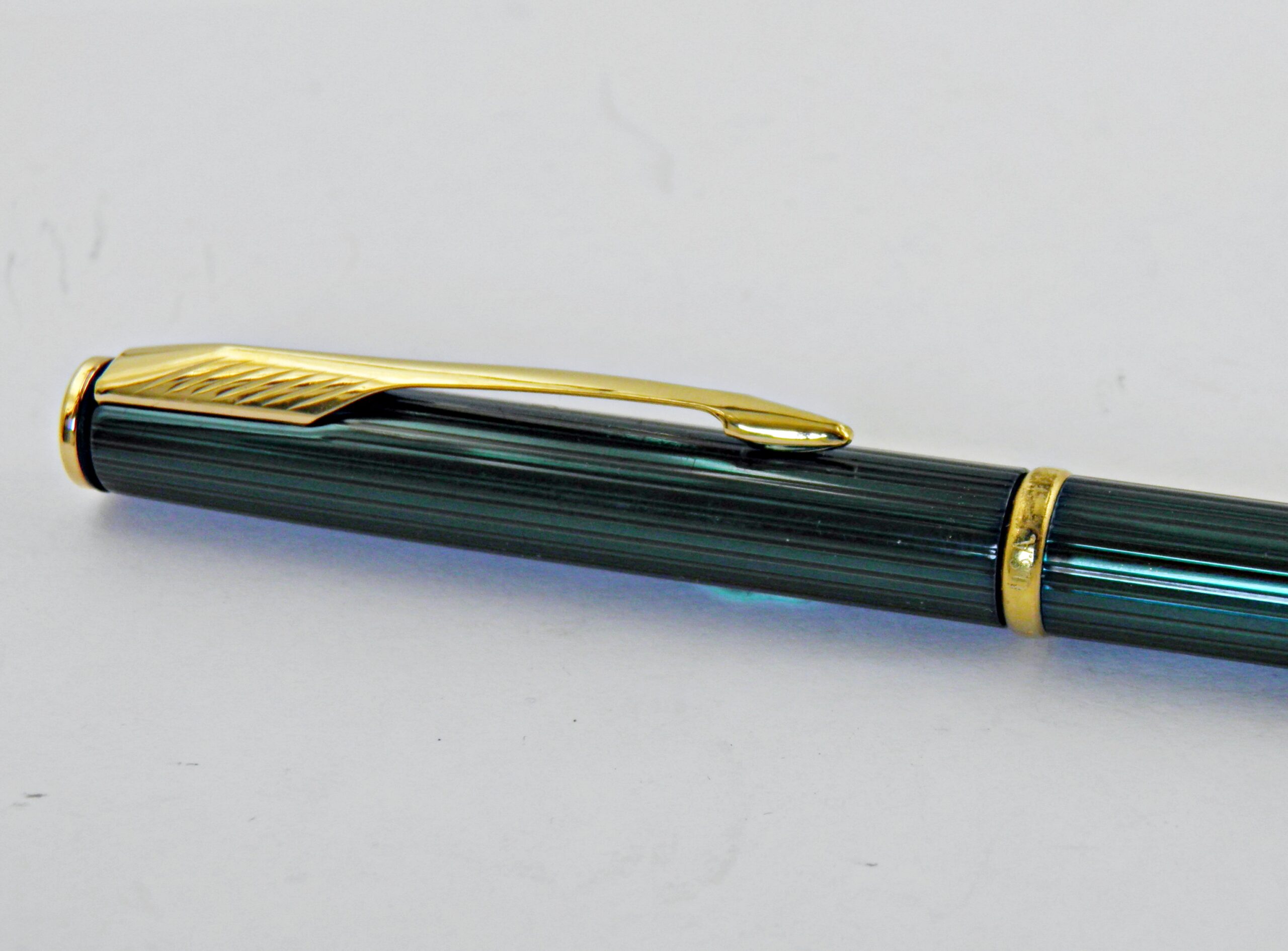 Ravissant stylo bille de la marque PARKER et datant des années 90’s. Il a une superbe résine verte translucide et ses attributs plaqués or, un modèle assez fin. Il sera livré avec sa recharge neuve. Un exemplaire à l’état NEUF.