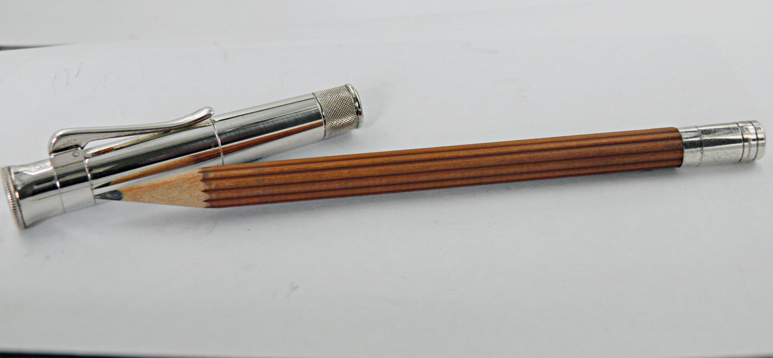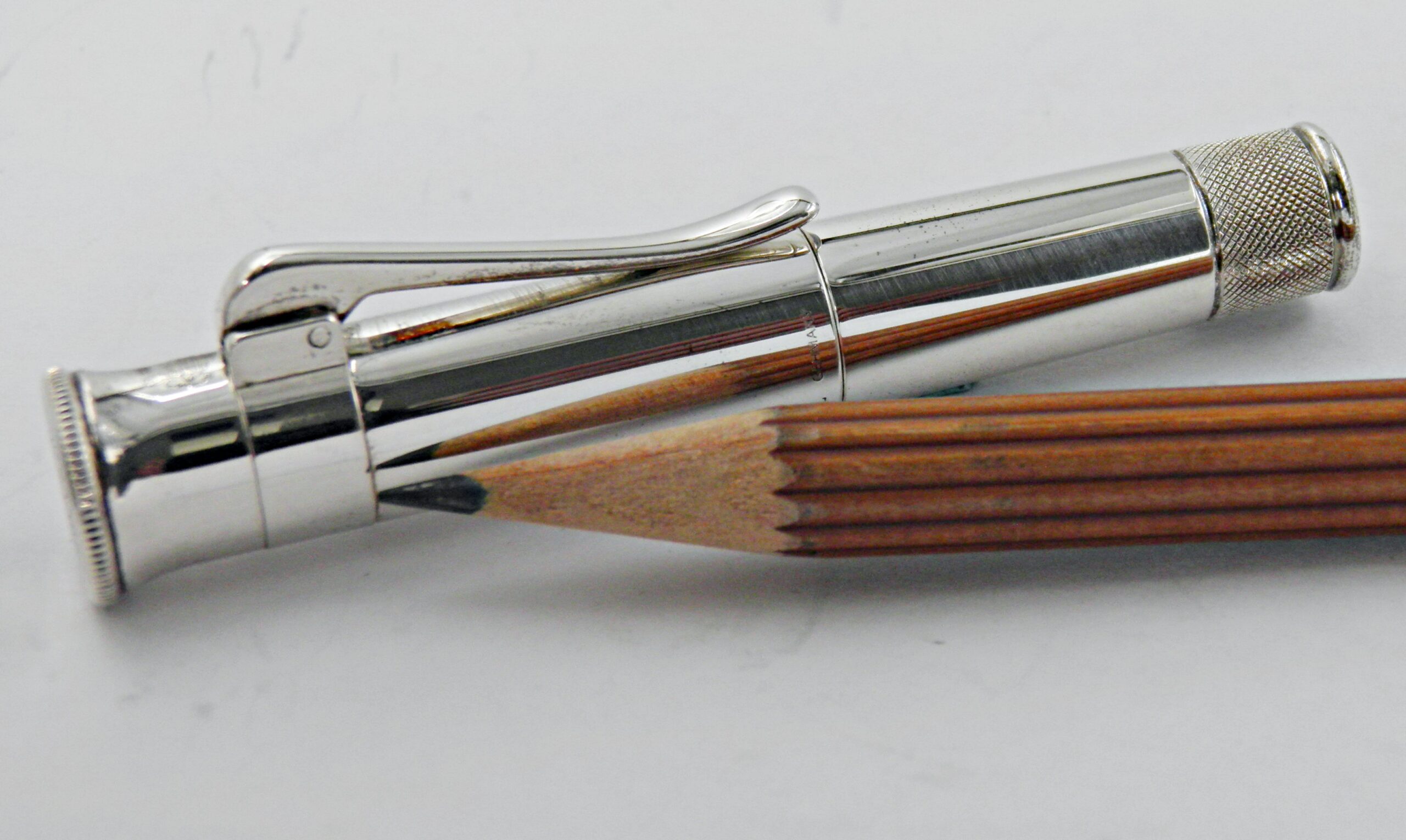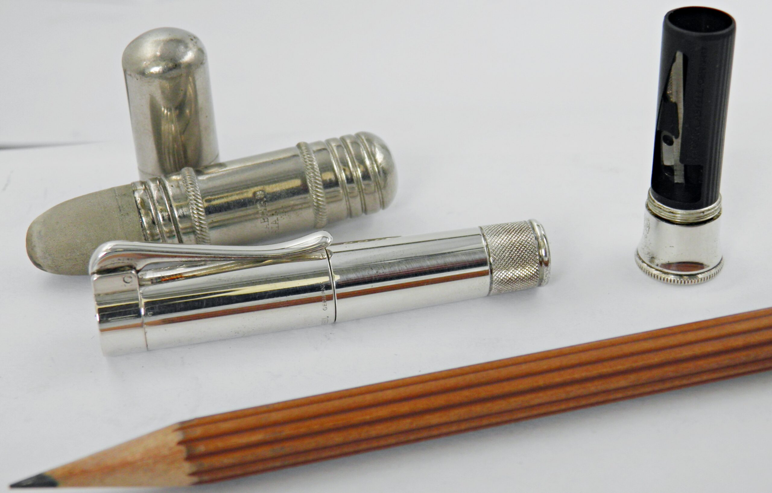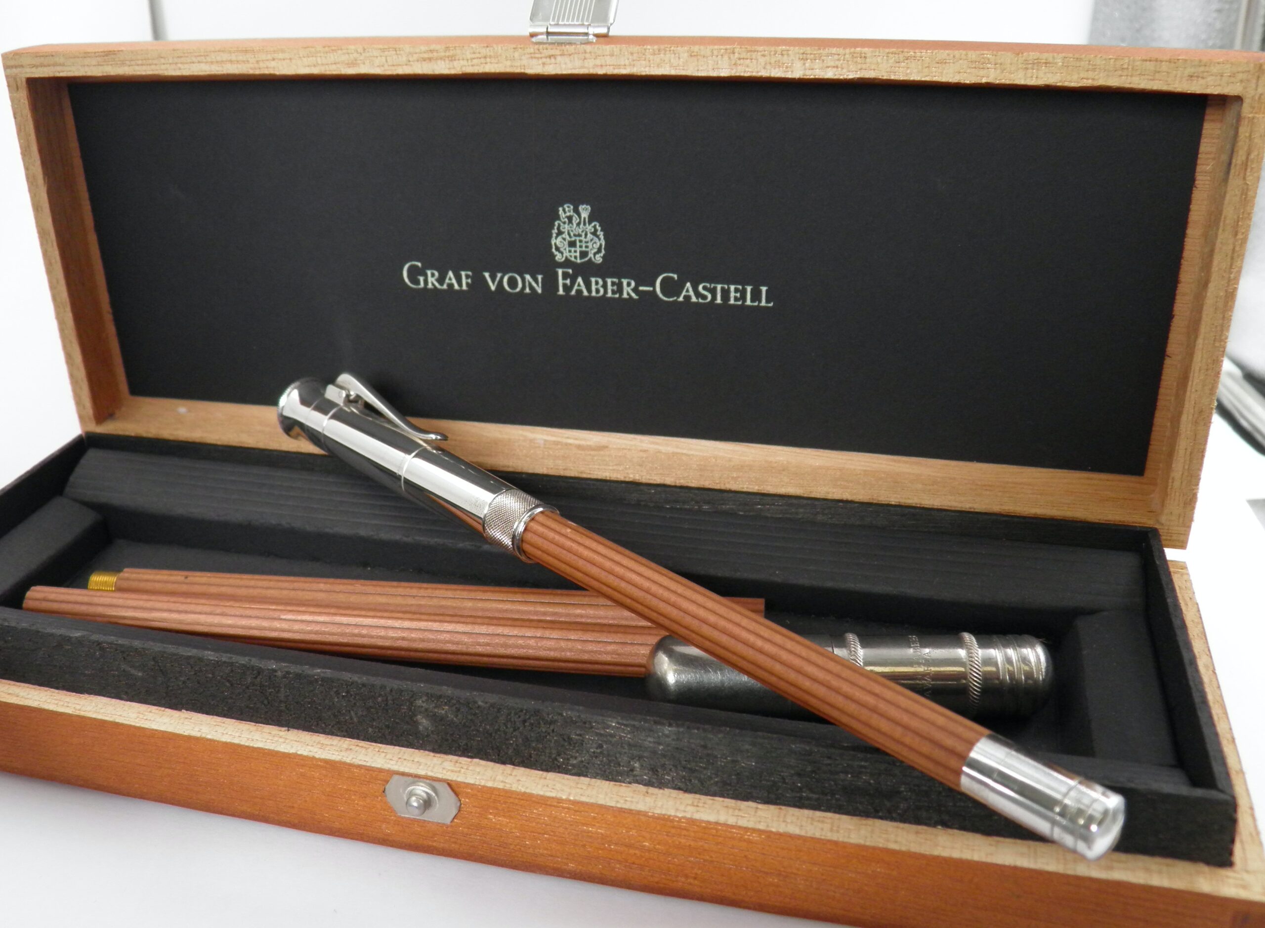 Un véritable instrument de dessin et d’écriture du fameux fabricant FABER CASTELL, l’inventeur de la mine graphite. Ce luxueux modèle de crayon interchangeable a ses attributs plaqués platine, un taille crayon est incorporé dans le capuchon et une gomme dissimulée à l’arrière du stylo. Je joins deux autres recharges neuves ainsi qu’une gomme sup plus grosse. Le tout sera livré dans le coffret Faber Castell avec son livret. Un exemplaire à l’état neuf.