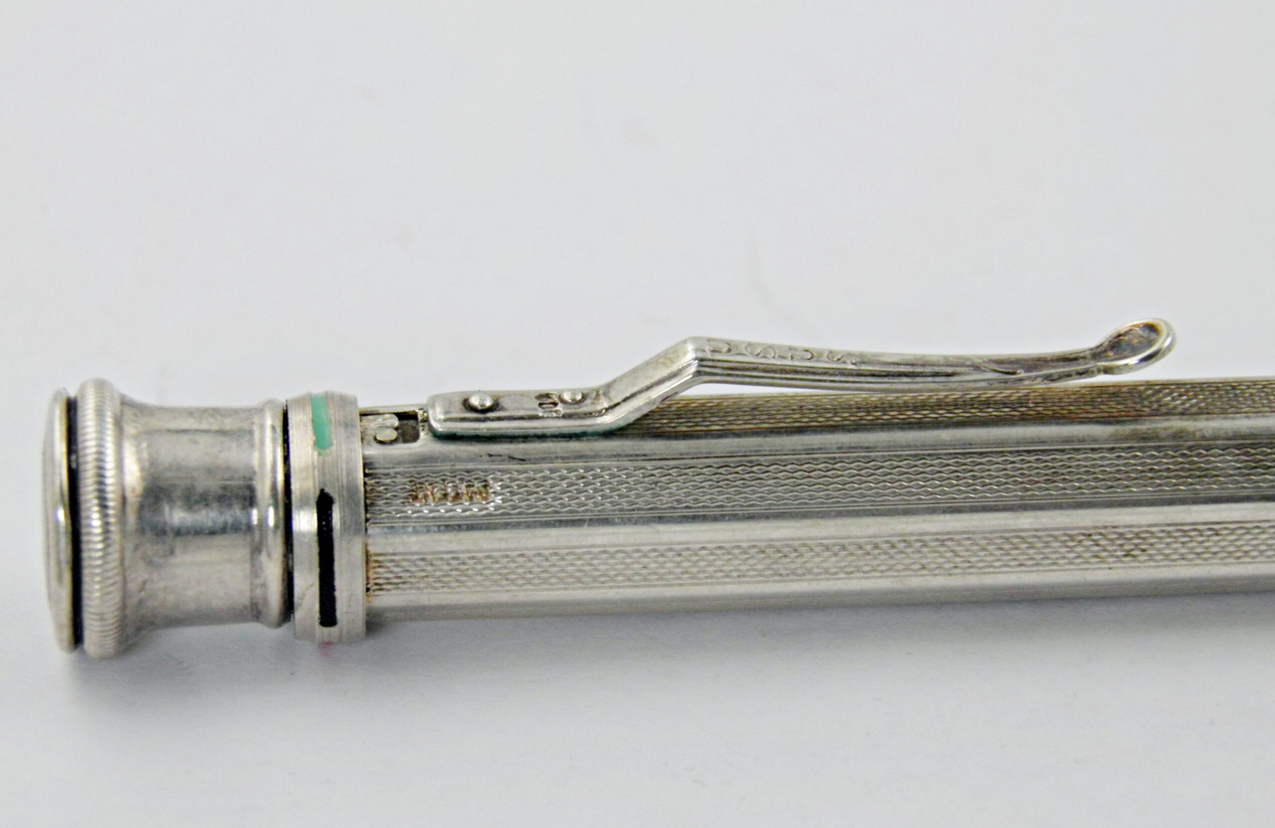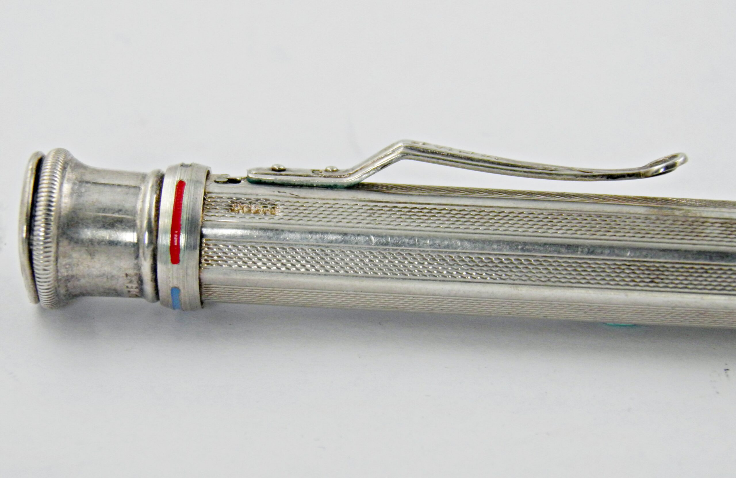 Un modèle de porte mines 4 couleurs peu courant, il est d’un assez gros diamètre. Il est signé USUS et le poinçon 900 pour l’argent. Son système de changement de couleurs est très sophistiqué. Excellent état et fonctionnement.